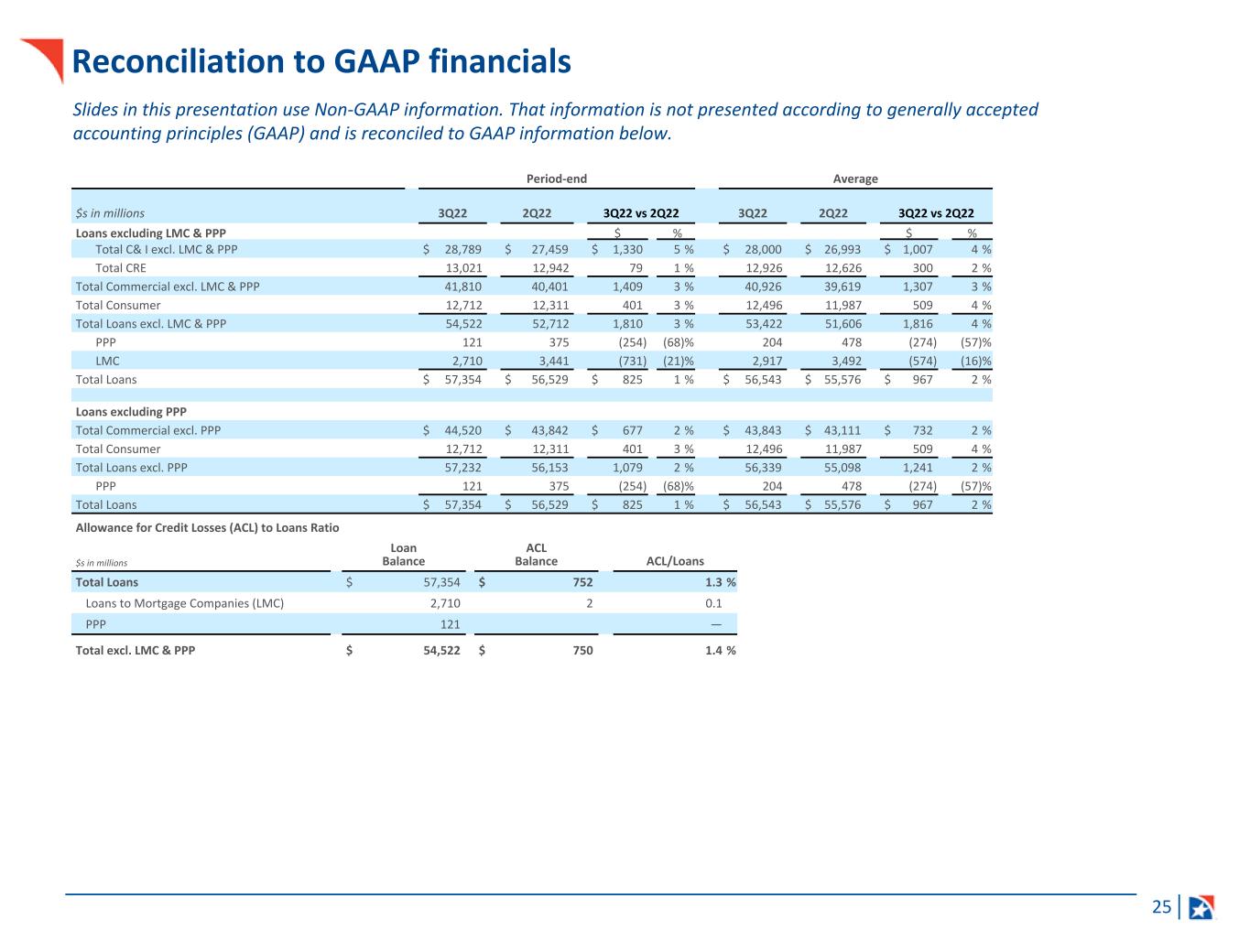 -PPPの影響前の平均貸出額は12億ドル増加しました。これは、商業用残高および消費者用不動産の増加が、モーゲージ会社(「LMC」)向け貸出の574百万ドルの減少により一部相殺されたことによるものです。