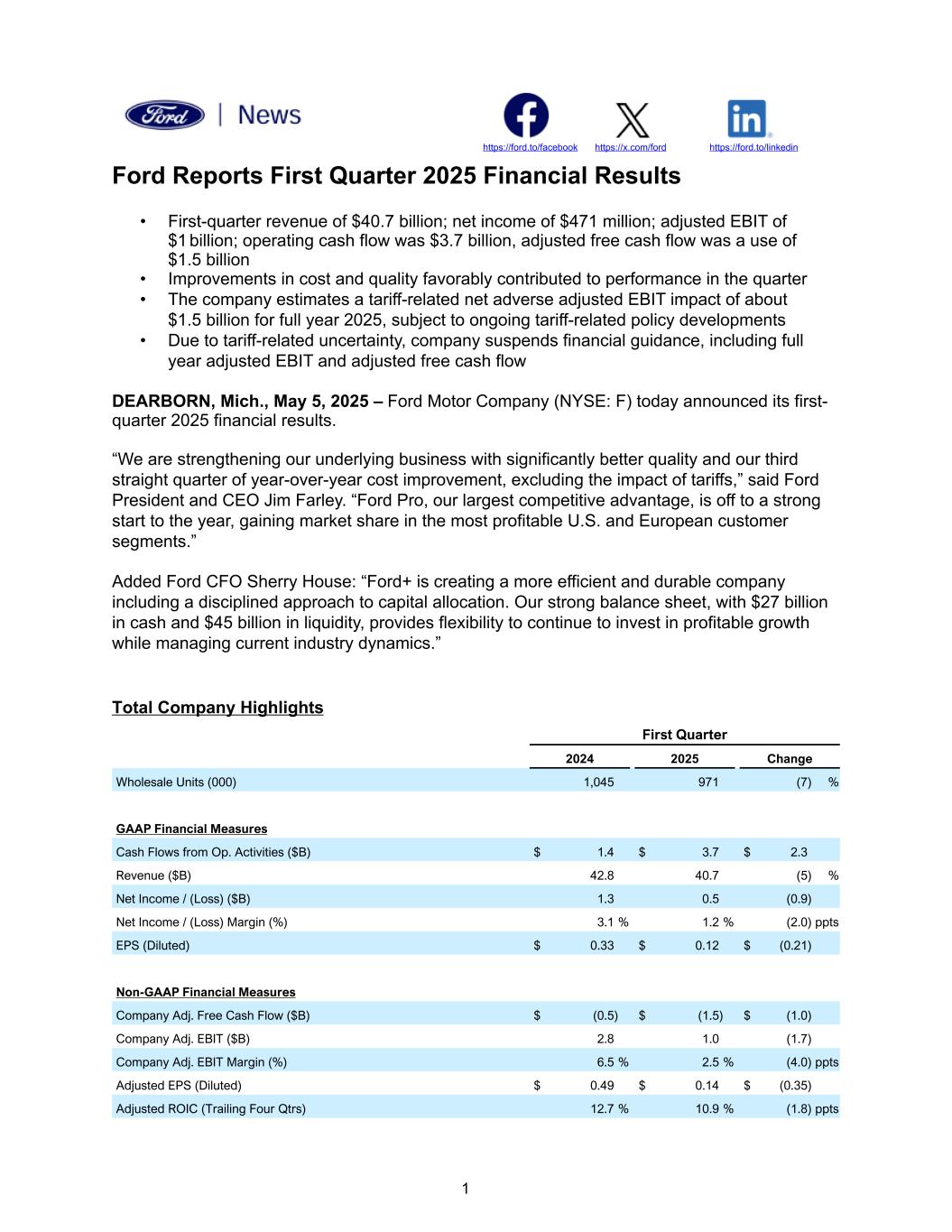 https://ford.to/facebook https://x.com/ford https://ford.to/linkedin Ford Reports First Quarter 2025 Financial Results • First-quarter revenue of $40.7 billion; net income of $471 million; adjusted EBIT of $1 billion; operating cash flow was $3.7 billion, adjusted free cash flow was a use of $1.5 billion • Improvements in cost and quality favorably contributed to performance in the quarter • The company estimates a tariff-related net adverse adjusted EBIT impact of about $1.5 billion for full year 2025, subject to ongoing tariff-related policy developments • Due to tariff-related uncertainty, company suspends financial guidance, including full year adjusted EBIT and adjusted free cash flow DEARBORN, Mich., May 5, 2025 – Ford Motor Company (NYSE: F) today announced its first- quarter 2025 financial results. “We are strengthening our underlying business with significantly better quality and our third straight quarter of year-over-year cost improvement, excluding the impact of tariffs,” said Ford President and CEO Jim Farley. “Ford Pro, our largest competitive advantage, is off to a strong start to the year, gaining market share in the most profitable U.S. and European customer segments.” Added Ford CFO Sherry House: “Ford+ is creating a more efficient and durable company including a disciplined approach to capital allocation. Our strong balance sheet, with $27 billion in cash and $45 billion in liquidity, provides flexibility to continue to invest in profitable growth while managing current industry dynamics.” Total Company Highlights First Quarter 2024 2025 Change Wholesale Units (000) 1,045 971 (7) % GAAP Financial Measures Cash Flows from Op. Activities ($B) $ 1.4 $ 3.7 $ 2.3 Revenue ($B) 42.8 40.7 (5) % Net Income / (Loss) ($B) 1.3 0.5 (0.9) Net Income / (Loss) Margin (%) 3.1 % 1.2 % (2.0) ppts EPS (Diluted) $ 0.33 $ 0.12 $ (0.21) Non-GAAP Financial Measures Company Adj. Free Cash Flow ($B) $ (0.5) $ (1.5) $ (1.0) Company Adj. EBIT ($B) 2.8 1.0 (1.7) Company Adj. EBIT Margin (%) 6.5 % 2.5 % (4.0) ppts Adjusted EPS (Diluted) $ 0.49 $ 0.14 $ (0.35) Adjusted ROIC (Trailing Four Qtrs) 12.7 % 10.9 % (1.8) ppts 1