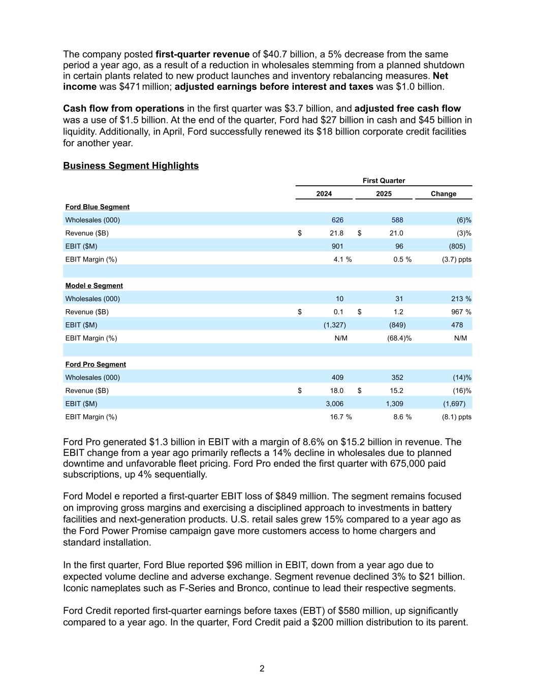 The company posted first-quarter revenue of $40.7 billion, a 5% decrease from the same period a year ago, as a result of a reduction in wholesales stemming from a planned shutdown in certain plants related to new product launches and inventory rebalancing measures. Net income was $471 million; adjusted earnings before interest and taxes was $1.0 billion. Cash flow from operations in the first quarter was $3.7 billion, and adjusted free cash flow was a use of $1.5 billion. At the end of the quarter, Ford had $27 billion in cash and $45 billion in liquidity. Additionally, in April, Ford successfully renewed its $18 billion corporate credit facilities for another year. Business Segment Highlights First Quarter 2024 2025 Change Ford Blue Segment Wholesales (000) 626 588 (6) % Revenue ($B) $ 21.8 $ 21.0 (3) % EBIT ($M) 901 96 (805) EBIT Margin (%) 4.1 % 0.5 % (3.7) ppts Model e Segment Wholesales (000) 10 31 213 % Revenue ($B) $ 0.1 $ 1.2 967 % EBIT ($M) (1,327) (849) 478 EBIT Margin (%) N/M (68.4) % N/M Ford Pro Segment Wholesales (000) 409 352 (14) % Revenue ($B) $ 18.0 $ 15.2 (16) % EBIT ($M) 3,006 1,309 (1,697) EBIT Margin (%) 16.7 % 8.6 % (8.1) ppts Ford Pro generated $1.3 billion in EBIT with a margin of 8.6% on $15.2 billion in revenue. The EBIT change from a year ago primarily reflects a 14% decline in wholesales due to planned downtime and unfavorable fleet pricing. Ford Pro ended the first quarter with 675,000 paid subscriptions, up 4% sequentially. Ford Model e reported a first-quarter EBIT loss of $849 million. The segment remains focused on improving gross margins and exercising a disciplined approach to investments in battery facilities and next-generation products. U.S. retail sales grew 15% compared to a year ago as the Ford Power Promise campaign gave more customers access to home chargers and standard installation. In the first quarter, Ford Blue reported $96 million in EBIT, down from a year ago due to expected volume decline and adverse exchange. Segment revenue declined 3% to $21 billion. Iconic nameplates such as F-Series and Bronco, continue to lead their respective segments. Ford Credit reported first-quarter earnings before taxes (EBT) of $580 million, up significantly compared to a year ago. In the quarter, Ford Credit paid a $200 million distribution to its parent. 2