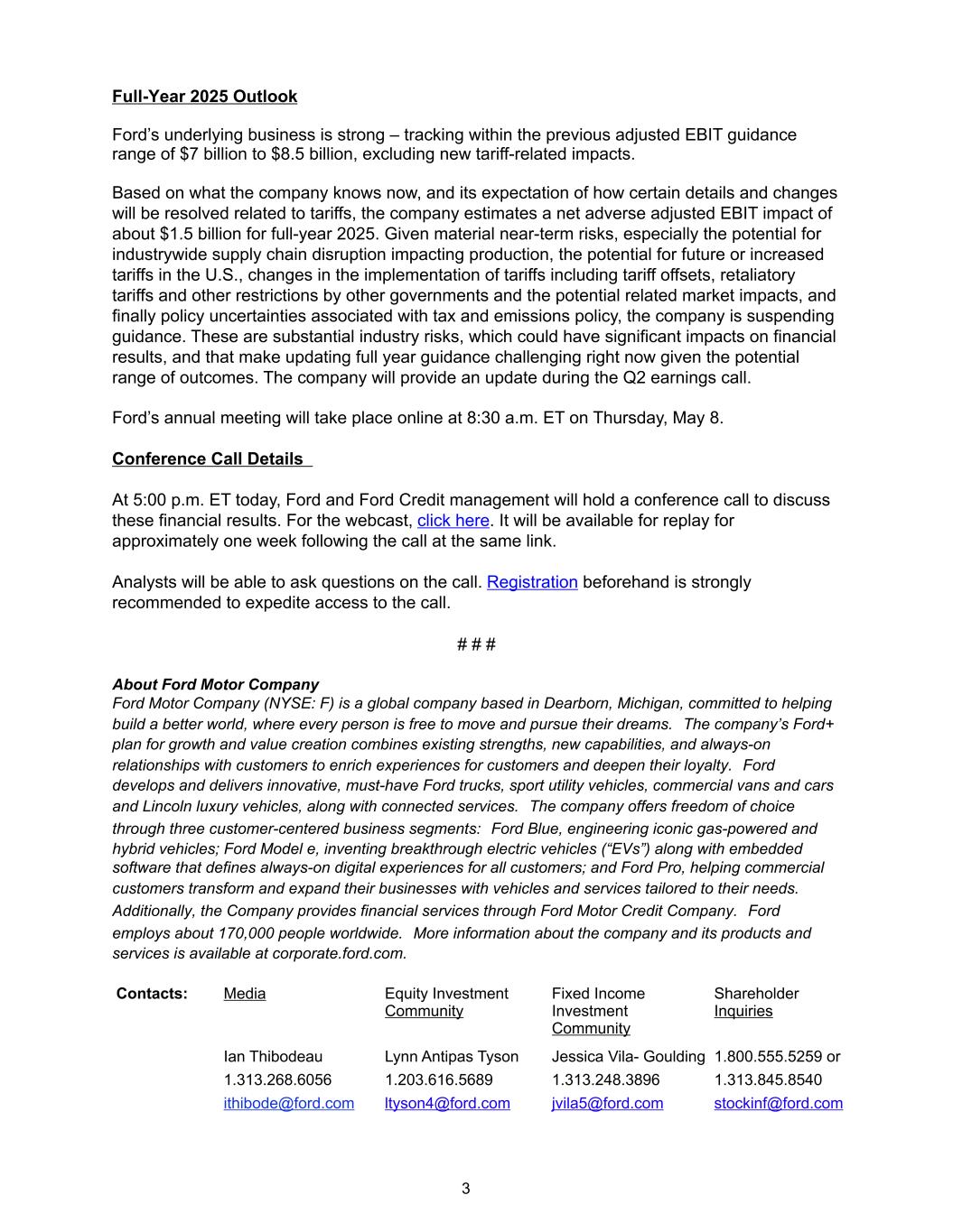 Full-Year 2025 Outlook Ford’s underlying business is strong – tracking within the previous adjusted EBIT guidance range of $7 billion to $8.5 billion, excluding new tariff-related impacts. Based on what the company knows now, and its expectation of how certain details and changes will be resolved related to tariffs, the company estimates a net adverse adjusted EBIT impact of about $1.5 billion for full-year 2025. Given material near-term risks, especially the potential for industrywide supply chain disruption impacting production, the potential for future or increased tariffs in the U.S., changes in the implementation of tariffs including tariff offsets, retaliatory tariffs and other restrictions by other governments and the potential related market impacts, and finally policy uncertainties associated with tax and emissions policy, the company is suspending guidance. These are substantial industry risks, which could have significant impacts on financial results, and that make updating full year guidance challenging right now given the potential range of outcomes. The company will provide an update during the Q2 earnings call. Ford’s annual meeting will take place online at 8:30 a.m. ET on Thursday, May 8. Conference Call Details At 5:00 p.m. ET today, Ford and Ford Credit management will hold a conference call to discuss these financial results. For the webcast, click here. It will be available for replay for approximately one week following the call at the same link. Analysts will be able to ask questions on the call. Registration beforehand is strongly recommended to expedite access to the call. # # # About Ford Motor Company Ford Motor Company (NYSE: F) is a global company based in Dearborn, Michigan, committed to helping build a better world, where every person is free to move and pursue their dreams. The company’s Ford+ plan for growth and value creation combines existing strengths, new capabilities, and always-on relationships with customers to enrich experiences for customers and deepen their loyalty. Ford develops and delivers innovative, must-have Ford trucks, sport utility vehicles, commercial vans and cars and Lincoln luxury vehicles, along with connected services. The company offers freedom of choice through three customer-centered business segments: Ford Blue, engineering iconic gas-powered and hybrid vehicles; Ford Model e, inventing breakthrough electric vehicles (“EVs”) along with embedded software that defines always-on digital experiences for all customers; and Ford Pro, helping commercial customers transform and expand their businesses with vehicles and services tailored to their needs. Additionally, the Company provides financial services through Ford Motor Credit Company. Ford employs about 170,000 people worldwide. More information about the company and its products and services is available at corporate.ford.com. Contacts: Media Equity Investment Community Fixed Income Investment Community Shareholder Inquiries Ian Thibodeau Lynn Antipas Tyson Jessica Vila- Goulding 1.800.555.5259 or 1.313.268.6056 1.203.616.5689 1.313.248.3896 1.313.845.8540 ithibode@ford.com ltyson4@ford.com jvila5@ford.com stockinf@ford.com 3