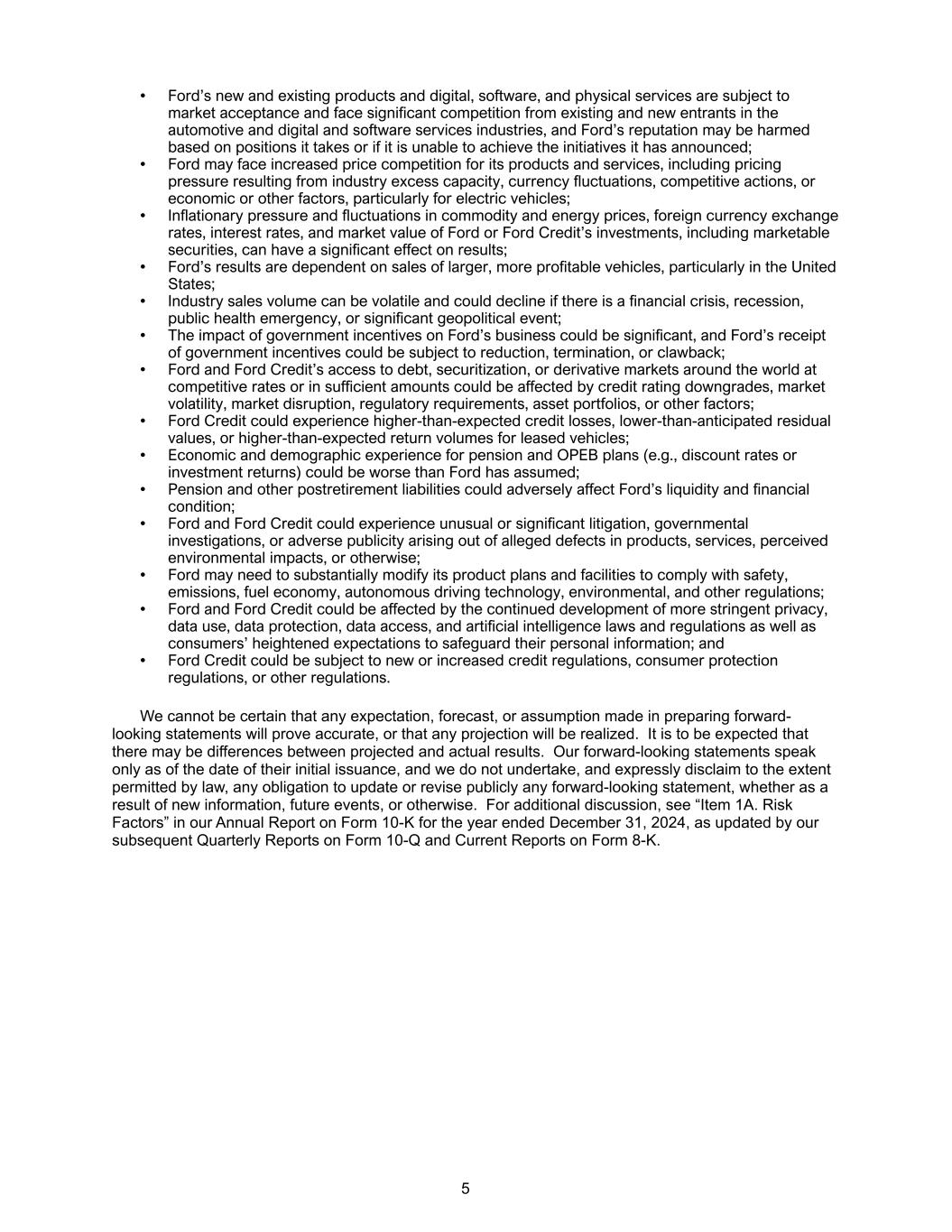 • Ford’s new and existing products and digital, software, and physical services are subject to market acceptance and face significant competition from existing and new entrants in the automotive and digital and software services industries, and Ford’s reputation may be harmed based on positions it takes or if it is unable to achieve the initiatives it has announced; • Ford may face increased price competition for its products and services, including pricing pressure resulting from industry excess capacity, currency fluctuations, competitive actions, or economic or other factors, particularly for electric vehicles; • Inflationary pressure and fluctuations in commodity and energy prices, foreign currency exchange rates, interest rates, and market value of Ford or Ford Credit’s investments, including marketable securities, can have a significant effect on results; • Ford’s results are dependent on sales of larger, more profitable vehicles, particularly in the United States; • Industry sales volume can be volatile and could decline if there is a financial crisis, recession, public health emergency, or significant geopolitical event; • The impact of government incentives on Ford’s business could be significant, and Ford’s receipt of government incentives could be subject to reduction, termination, or clawback; • Ford and Ford Credit’s access to debt, securitization, or derivative markets around the world at competitive rates or in sufficient amounts could be affected by credit rating downgrades, market volatility, market disruption, regulatory requirements, asset portfolios, or other factors; • Ford Credit could experience higher-than-expected credit losses, lower-than-anticipated residual values, or higher-than-expected return volumes for leased vehicles; • Economic and demographic experience for pension and OPEB plans (e.g., discount rates or investment returns) could be worse than Ford has assumed; • Pension and other postretirement liabilities could adversely affect Ford’s liquidity and financial condition; • Ford and Ford Credit could experience unusual or significant litigation, governmental investigations, or adverse publicity arising out of alleged defects in products, services, perceived environmental impacts, or otherwise; • Ford may need to substantially modify its product plans and facilities to comply with safety, emissions, fuel economy, autonomous driving technology, environmental, and other regulations; • Ford and Ford Credit could be affected by the continued development of more stringent privacy, data use, data protection, data access, and artificial intelligence laws and regulations as well as consumers’ heightened expectations to safeguard their personal information; and • Ford Credit could be subject to new or increased credit regulations, consumer protection regulations, or other regulations. We cannot be certain that any expectation, forecast, or assumption made in preparing forward- looking statements will prove accurate, or that any projection will be realized. It is to be expected that there may be differences between projected and actual results. Our forward-looking statements speak only as of the date of their initial issuance, and we do not undertake, and expressly disclaim to the extent permitted by law, any obligation to update or revise publicly any forward-looking statement, whether as a result of new information, future events, or otherwise. For additional discussion, see “Item 1A. Risk Factors” in our Annual Report on Form 10-K for the year ended December 31, 2024, as updated by our subsequent Quarterly Reports on Form 10-Q and Current Reports on Form 8-K. 5