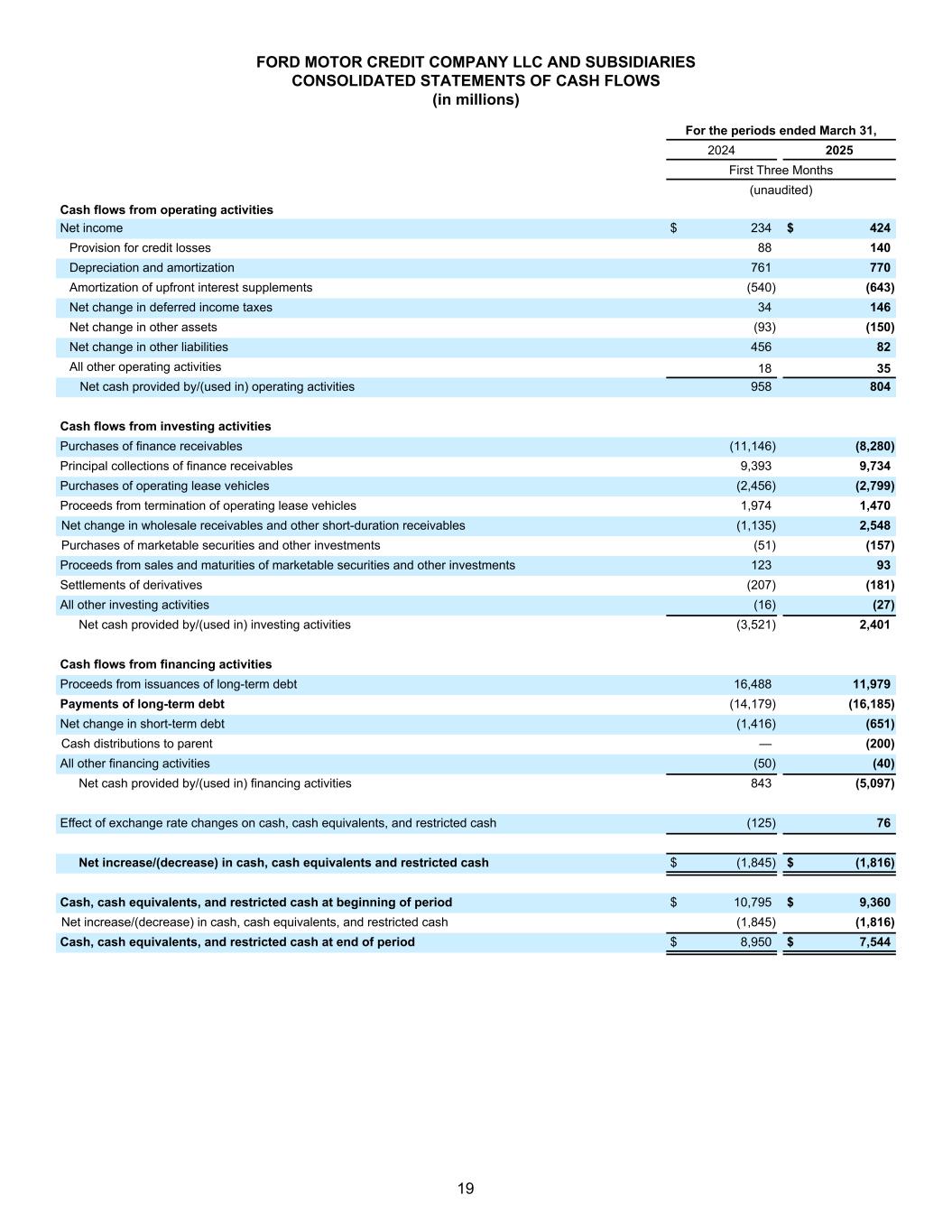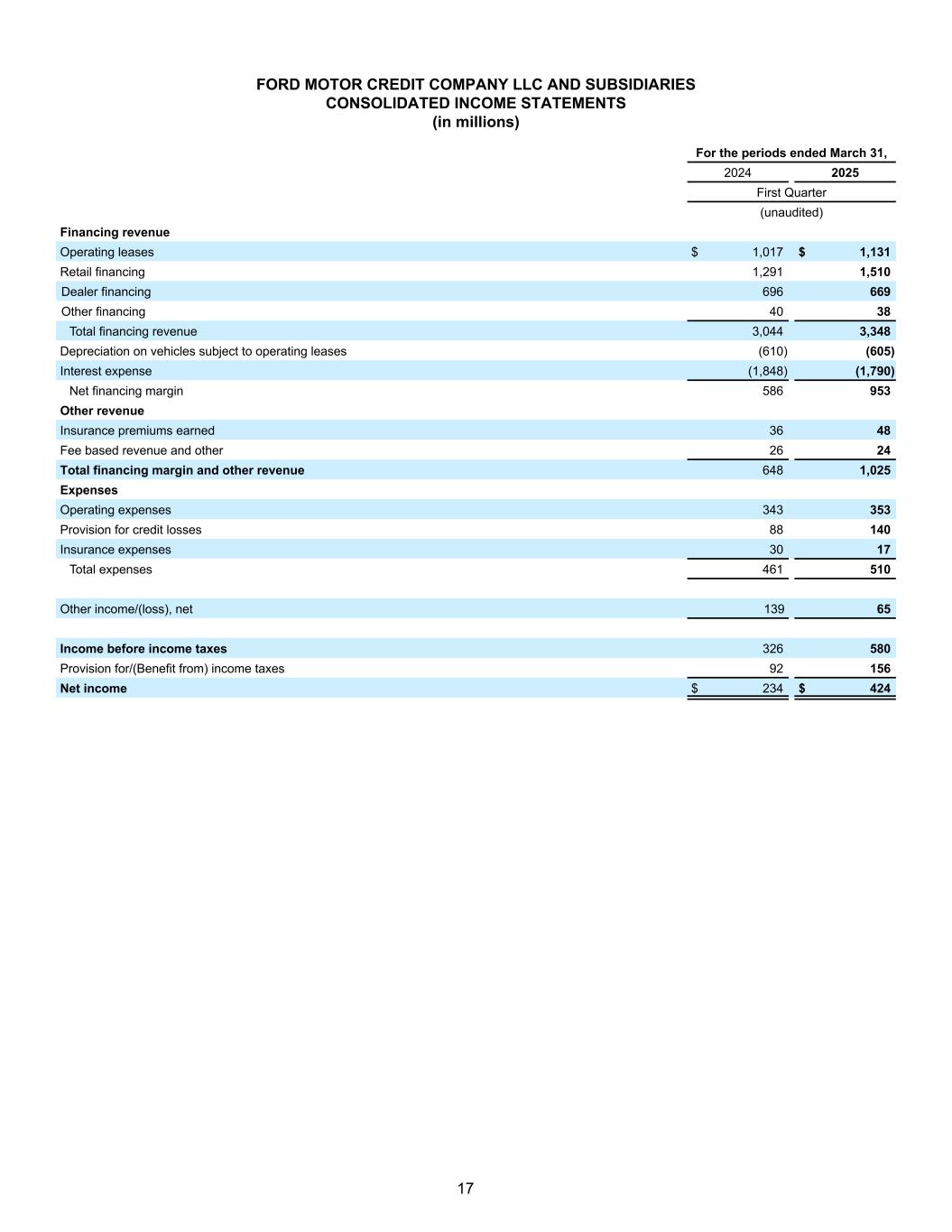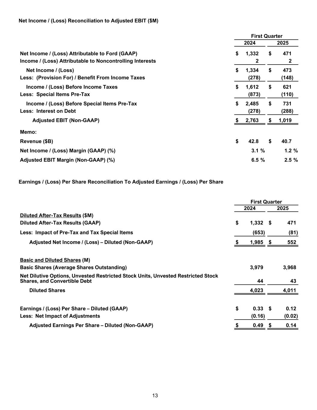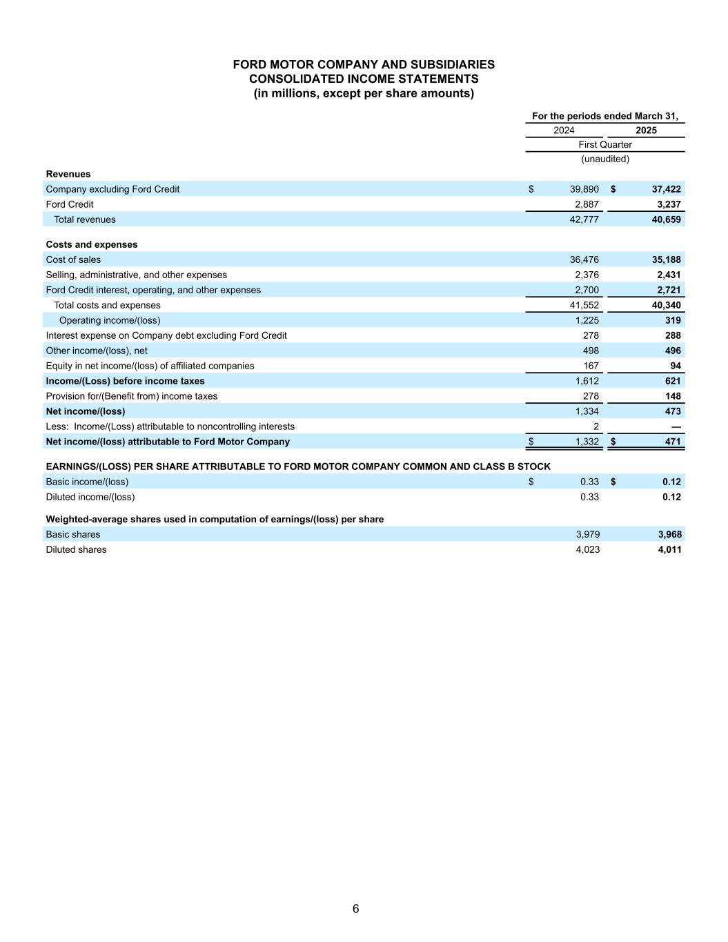 FORD MOTOR COMPANY AND SUBSIDIARIES CONSOLIDATED INCOME STATEMENTS (in millions, except per share amounts) For the periods ended March 31, 2024 2025 First Quarter (unaudited) Revenues Company excluding Ford Credit $ 39,890 $ 37,422 Ford Credit 2,887 3,237 Total revenues 42,777 40,659 Costs and expenses Cost of sales 36,476 35,188 Selling, administrative, and other expenses 2,376 2,431 Ford Credit interest, operating, and other expenses 2,700 2,721 Total costs and expenses 41,552 40,340 Operating income/(loss) 1,225 319 Interest expense on Company debt excluding Ford Credit 278 288 Other income/(loss), net 498 496 Equity in net income/(loss) of affiliated companies 167 94 Income/(Loss) before income taxes 1,612 621 Provision for/(Benefit from) income taxes 278 148 Net income/(loss) 1,334 473 Less: Income/(Loss) attributable to noncontrolling interests 2 — Net income/(loss) attributable to Ford Motor Company $ 1,332 $ 471 EARNINGS/(LOSS) PER SHARE ATTRIBUTABLE TO FORD MOTOR COMPANY COMMON AND CLASS B STOCK Basic income/(loss) $ 0.33 $ 0.12 Diluted income/(loss) 0.33 0.12 Weighted-average shares used in computation of earnings/(loss) per share Basic shares 3,979 3,968 Diluted shares 4,023 4,011 6
