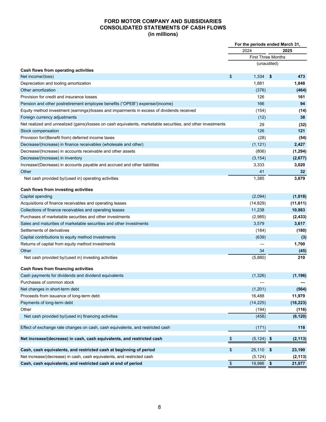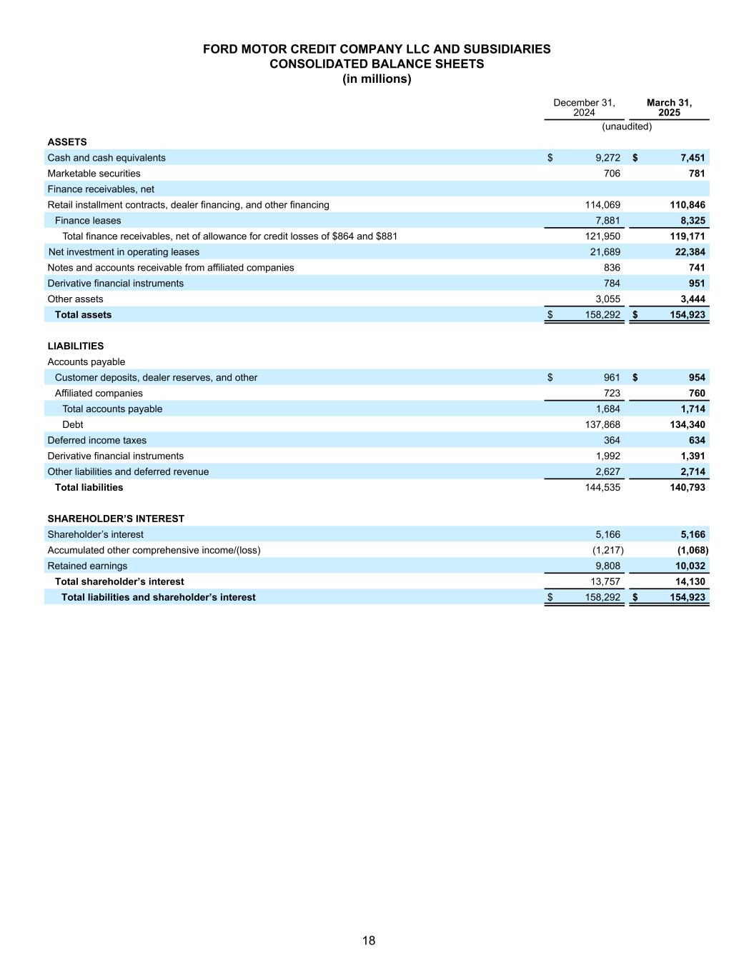 FORD MOTOR COMPANY AND SUBSIDIARIES CONSOLIDATED BALANCE SHEETS (in millions) December 31, 2024 March 31, 2025 (unaudited) ASSETS Cash and cash equivalents $ 22,935 $ 20,864 Marketable securities 15,413 14,362 Ford Credit finance receivables, net of allowance for credit losses of $247 and $257 51,850 47,997 Trade and other receivables, less allowances of $84 and $94 14,723 17,225 Inventories 14,951 17,895 Other assets 4,602 4,711 Total current assets 124,474 123,054 Ford Credit finance receivables, net of allowance for credit losses of $617 and 624 59,786 59,049 Net investment in operating leases 22,947 23,820 Net property 41,928 42,471 Equity in net assets of affiliated companies 6,821 5,168 Deferred income taxes 16,375 17,022 Other assets 12,865 13,955 Total assets $ 285,196 $ 284,539 LIABILITIES Payables $ 24,128 $ 26,259 Other liabilities and deferred revenue 27,782 28,033 Debt payable within one year Company excluding Ford Credit 1,756 4,286 Ford Credit 53,193 50,154 Total current liabilities 106,859 108,732 Other liabilities and deferred revenue 28,832 28,883 Long-term debt Company excluding Ford Credit 18,898 16,644 Ford Credit 84,675 84,186 Deferred income taxes 1,074 1,434 Total liabilities 240,338 239,879 EQUITY Common Stock, par value $0.01 per share (4,126 million shares issued of 6 billion authorized) 41 41 Class B Stock, par value $0.01 per share (71 million shares issued of 530 million authorized) 1 1 Capital in excess of par value of stock 23,502 23,562 Retained earnings 33,740 32,999 Accumulated other comprehensive income/(loss) (9,639) (9,158) Treasury stock (2,810) (2,810) Total equity attributable to Ford Motor Company 44,835 44,635 Equity attributable to noncontrolling interests 23 25 Total equity 44,858 44,660 Total liabilities and equity $ 285,196 $ 284,539 7