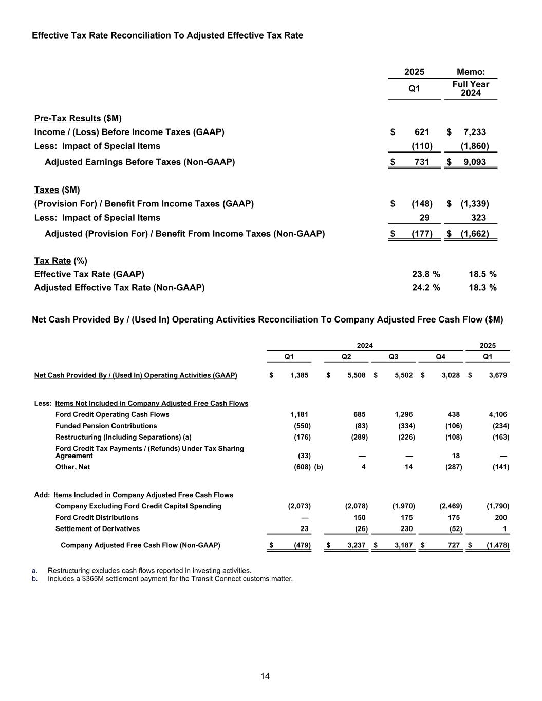 The following applies to the information throughout this release: • See tables later in this release for the nature and amount of special items, and reconciliations of the non-GAAP financial measures designated as “adjusted” to the most comparable financial measures calculated in accordance with U.S. generally accepted accounting principles (“GAAP”). • Wholesale unit and production volumes include Ford and Lincoln brand vehicles produced and sold by Ford or our unconsolidated affiliates and Jiangling Motors Corporation (“JMC”) brand vehicles produced and sold in China by our unconsolidated affiliate. Revenue does not include vehicles produced and sold by our unconsolidated affiliates. Wholesales and revenue exclude transactions between the Ford Blue, Ford Model e and Ford Pro business segments. See materials supporting the May 5, 2025, conference call at shareholder.ford.com for further discussion of wholesale unit volumes. Cautionary Note on Forward-Looking Statements Statements included or incorporated by reference herein may constitute “forward-looking statements” within the meaning of the Private Securities Litigation Reform Act of 1995. Forward-looking statements are based on expectations, forecasts, and assumptions by our management and involve a number of risks, uncertainties, and other factors that could cause actual results to differ materially from those stated, including, without limitation: • Ford’s long-term success depends on delivering the Ford+ plan, including improving cost and competitiveness; • Ford’s vehicles could be affected by defects that result in recall campaigns, increased warranty costs, or delays in new model launches, and the time it takes to improve the quality of our vehicles and services and reduce the costs associated therewith could continue to have an adverse effect on our business; • Ford is highly dependent on its suppliers to deliver components in accordance with Ford’s production schedule and specifications, and a shortage of or inability to timely acquire key components or raw materials can disrupt Ford’s production of vehicles; • Ford’s production, as well as Ford’s suppliers’ production, and/or the ability to deliver products to consumers could be disrupted by labor issues, public health issues, natural or man-made disasters, adverse effects of climate change, financial distress, production difficulties, capacity limitations, or other factors; • Ford may not realize the anticipated benefits of existing or pending strategic alliances, joint ventures, acquisitions, divestitures, or business strategies or the benefits may take longer than expected to materialize; • Ford may not realize the anticipated benefits of restructuring actions and such actions may cause Ford to incur significant charges, disrupt our operations, or harm our reputation; • Failure to develop and deploy secure digital services that appeal to customers and grow our subscription rates could have a negative impact on Ford’s business; • Ford’s ability to maintain a competitive cost structure could be affected by labor or other constraints; • Ford’s ability to attract, develop, grow, support, and reward talent is critical to its success and competitiveness; • Operational information systems, security systems, vehicles, and services could be affected by cybersecurity incidents, ransomware attacks, and other disruptions and impact Ford, Ford Credit, their suppliers, and dealers; • To facilitate access to the raw materials and other components necessary for the production of electric vehicles, Ford has entered into and may, in the future, enter into multi-year commitments to raw material and other suppliers that subject Ford to risks associated with lower future demand for such items as well as costs that fluctuate and are difficult to accurately forecast; • With a global footprint and supply chain, Ford’s results and operations could be adversely affected by economic or geopolitical developments, including protectionist trade policies such as tariffs, or other events; 4