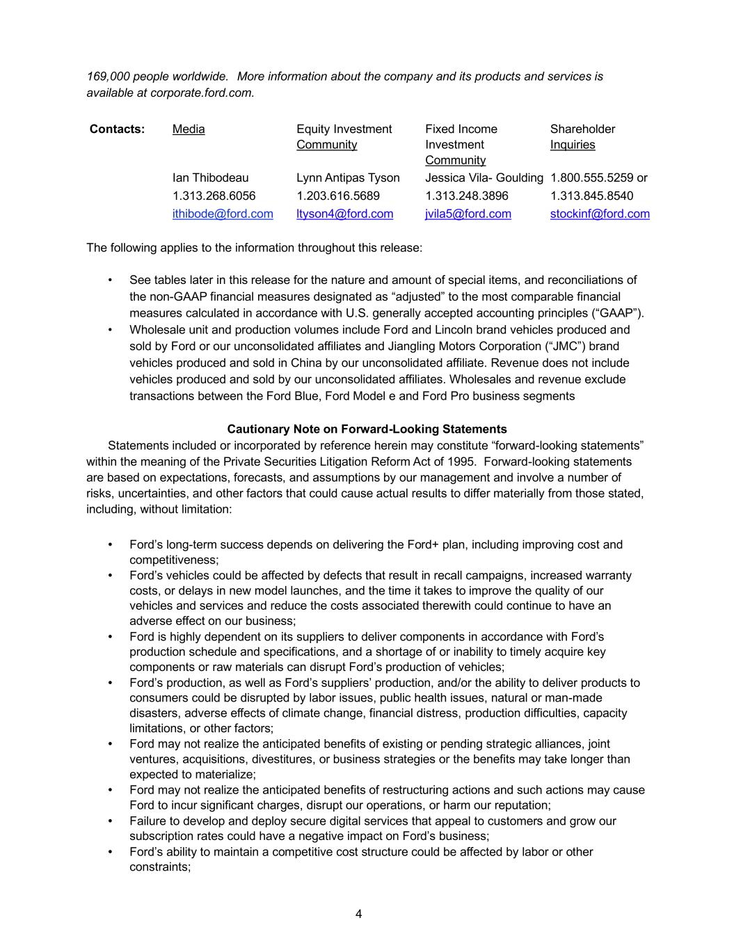 4 169,000 people worldwide. More information about the company and its products and services is available at corporate.ford.com. Contacts: Media Equity Investment Community Fixed Income Investment Community Shareholder Inquiries Ian Thibodeau Lynn Antipas Tyson Jessica Vila- Goulding 1.800.555.5259 or 1.313.268.6056 1.203.616.5689 1.313.248.3896 1.313.845.8540 ithibode@ford.com ltyson4@ford.com jvila5@ford.com stockinf@ford.com The following applies to the information throughout this release: • See tables later in this release for the nature and amount of special items, and reconciliations of the non-GAAP financial measures designated as “adjusted” to the most comparable financial measures calculated in accordance with U.S. generally accepted accounting principles (“GAAP”). • Wholesale unit and production volumes include Ford and Lincoln brand vehicles produced and sold by Ford or our unconsolidated affiliates and Jiangling Motors Corporation (“JMC”) brand vehicles produced and sold in China by our unconsolidated affiliate. Revenue does not include vehicles produced and sold by our unconsolidated affiliates. Wholesales and revenue exclude transactions between the Ford Blue, Ford Model e and Ford Pro business segments Cautionary Note on Forward-Looking Statements Statements included or incorporated by reference herein may constitute “forward-looking statements” within the meaning of the Private Securities Litigation Reform Act of 1995. Forward-looking statements are based on expectations, forecasts, and assumptions by our management and involve a number of risks, uncertainties, and other factors that could cause actual results to differ materially from those stated, including, without limitation: • Ford’s long-term success depends on delivering the Ford+ plan, including improving cost and competitiveness; • Ford’s vehicles could be affected by defects that result in recall campaigns, increased warranty costs, or delays in new model launches, and the time it takes to improve the quality of our vehicles and services and reduce the costs associated therewith could continue to have an adverse effect on our business; • Ford is highly dependent on its suppliers to deliver components in accordance with Ford’s production schedule and specifications, and a shortage of or inability to timely acquire key components or raw materials can disrupt Ford’s production of vehicles; • Ford’s production, as well as Ford’s suppliers’ production, and/or the ability to deliver products to consumers could be disrupted by labor issues, public health issues, natural or man-made disasters, adverse effects of climate change, financial distress, production difficulties, capacity limitations, or other factors; • Ford may not realize the anticipated benefits of existing or pending strategic alliances, joint ventures, acquisitions, divestitures, or business strategies or the benefits may take longer than expected to materialize; • Ford may not realize the anticipated benefits of restructuring actions and such actions may cause Ford to incur significant charges, disrupt our operations, or harm our reputation; • Failure to develop and deploy secure digital services that appeal to customers and grow our subscription rates could have a negative impact on Ford’s business; • Ford’s ability to maintain a competitive cost structure could be affected by labor or other constraints;