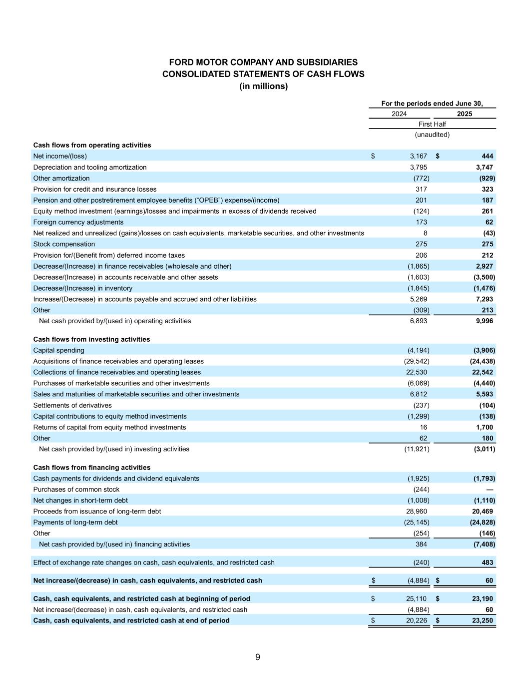 9 FORD MOTOR COMPANY AND SUBSIDIARIES CONSOLIDATED STATEMENTS OF CASH FLOWS (in millions) For the periods ended June 30, 2024 2025 First Half (unaudited) Cash flows from operating activities Net income/(loss) $ 3,167 $ 444 Depreciation and tooling amortization 3,795 3,747 Other amortization (772) (929) Provision for credit and insurance losses 317 323 Pension and other postretirement employee benefits (“OPEB”) expense/(income) 201 187 Equity method investment (earnings)/losses and impairments in excess of dividends received (124) 261 Foreign currency adjustments 173 62 Net realized and unrealized (gains)/losses on cash equivalents, marketable securities, and other investments 8 (43) Stock compensation 275 275 Provision for/(Benefit from) deferred income taxes 206 212 Decrease/(Increase) in finance receivables (wholesale and other) (1,865) 2,927 Decrease/(Increase) in accounts receivable and other assets (1,603) (3,500) Decrease/(Increase) in inventory (1,845) (1,476) Increase/(Decrease) in accounts payable and accrued and other liabilities 5,269 7,293 Other (309) 213 Net cash provided by/(used in) operating activities 6,893 9,996 Cash flows from investing activities Capital spending (4,194) (3,906) Acquisitions of finance receivables and operating leases (29,542) (24,438) Collections of finance receivables and operating leases 22,530 22,542 Purchases of marketable securities and other investments (6,069) (4,440) Sales and maturities of marketable securities and other investments 6,812 5,593 Settlements of derivatives (237) (104) Capital contributions to equity method investments (1,299) (138) Returns of capital from equity method investments 16 1,700 Other 62 180 Net cash provided by/(used in) investing activities (11,921) (3,011) Cash flows from financing activities Cash payments for dividends and dividend equivalents (1,925) (1,793) Purchases of common stock (244) — Net changes in short-term debt (1,008) (1,110) Proceeds from issuance of long-term debt 28,960 20,469 Payments of long-term debt (25,145) (24,828) Other (254) (146) Net cash provided by/(used in) financing activities 384 (7,408) Effect of exchange rate changes on cash, cash equivalents, and restricted cash (240) 483 Net increase/(decrease) in cash, cash equivalents, and restricted cash $ (4,884) $ 60 Cash, cash equivalents, and restricted cash at beginning of period $ 25,110 $ 23,190 Net increase/(decrease) in cash, cash equivalents, and restricted cash (4,884) 60 Cash, cash equivalents, and restricted cash at end of period $ 20,226 $ 23,250