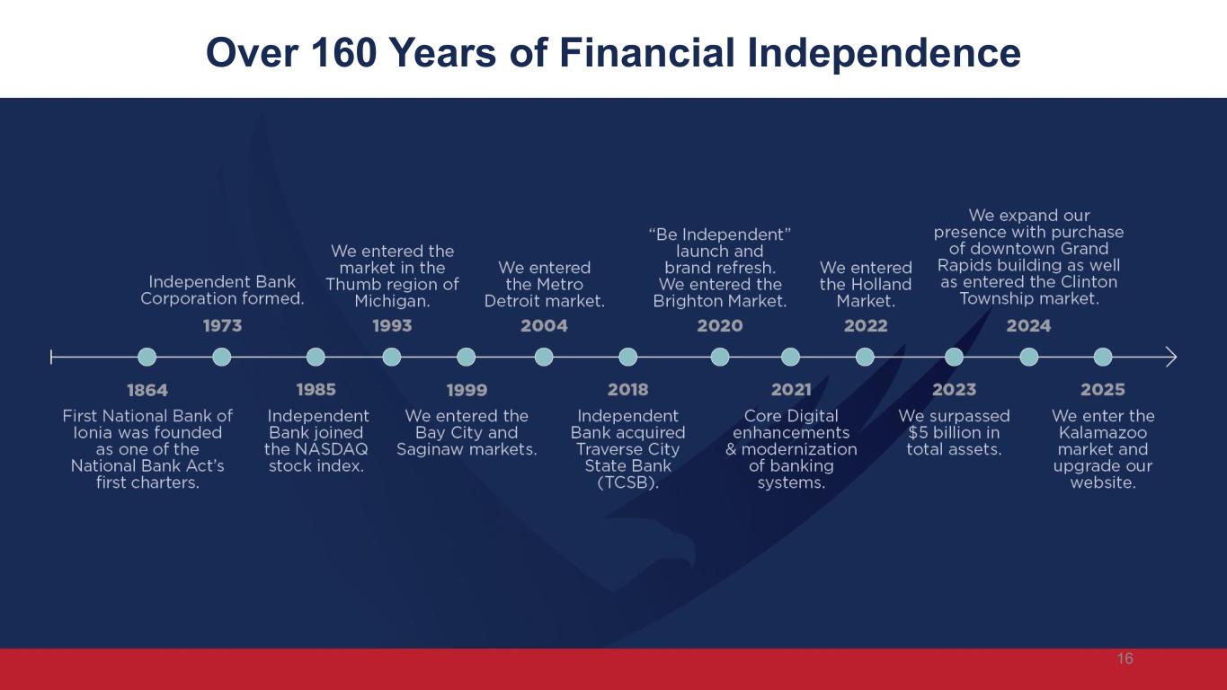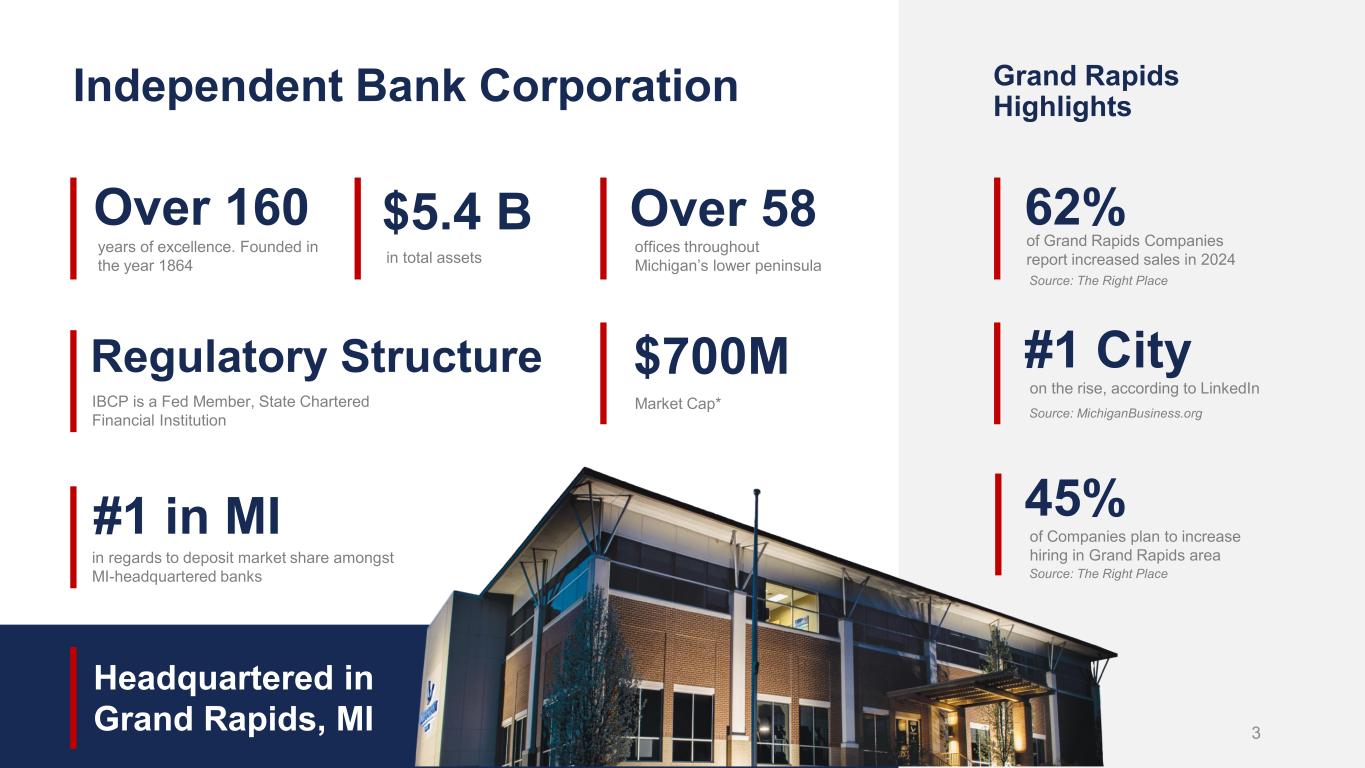 Independent Bank Corporation 3 years of excellence. Founded in the year 1864 $5.4 B in total assets Over 160 Over 58 offices throughout Michigan’s lower peninsula IBCP is a Fed Member, State Chartered Financial Institution Regulatory Structure 62% of Grand Rapids Companies report increased sales in 2024 $700M Market Cap* in regards to deposit market share amongst MI-headquartered banks #1 in MI #1 City on the rise, according to LinkedIn 45% of Companies plan to increase hiring in Grand Rapids area Source: The Right Place Headquartered in Grand Rapids, MI Grand Rapids Highlights Source: MichiganBusiness.org Source: The Right Place