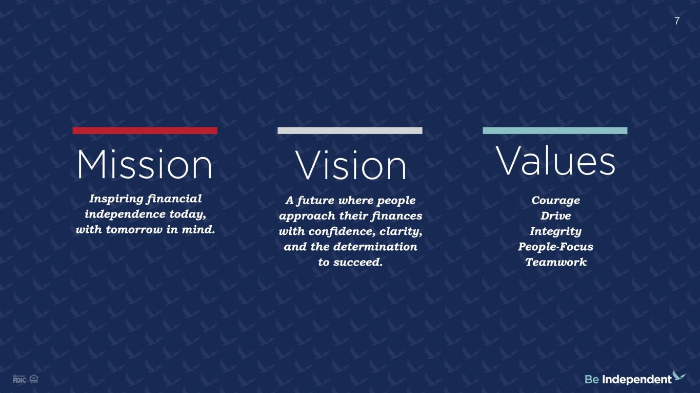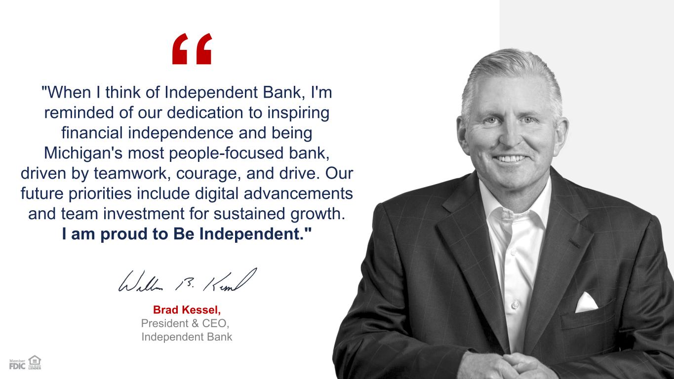 6 “"When I think of Independent Bank, I'm reminded of our dedication to inspiring financial independence and being Michigan's most people-focused bank, driven by teamwork, courage, and drive. Our future priorities include digital advancements and team investment for sustained growth. I am proud to Be Independent." Brad Kessel, President & CEO, Independent Bank