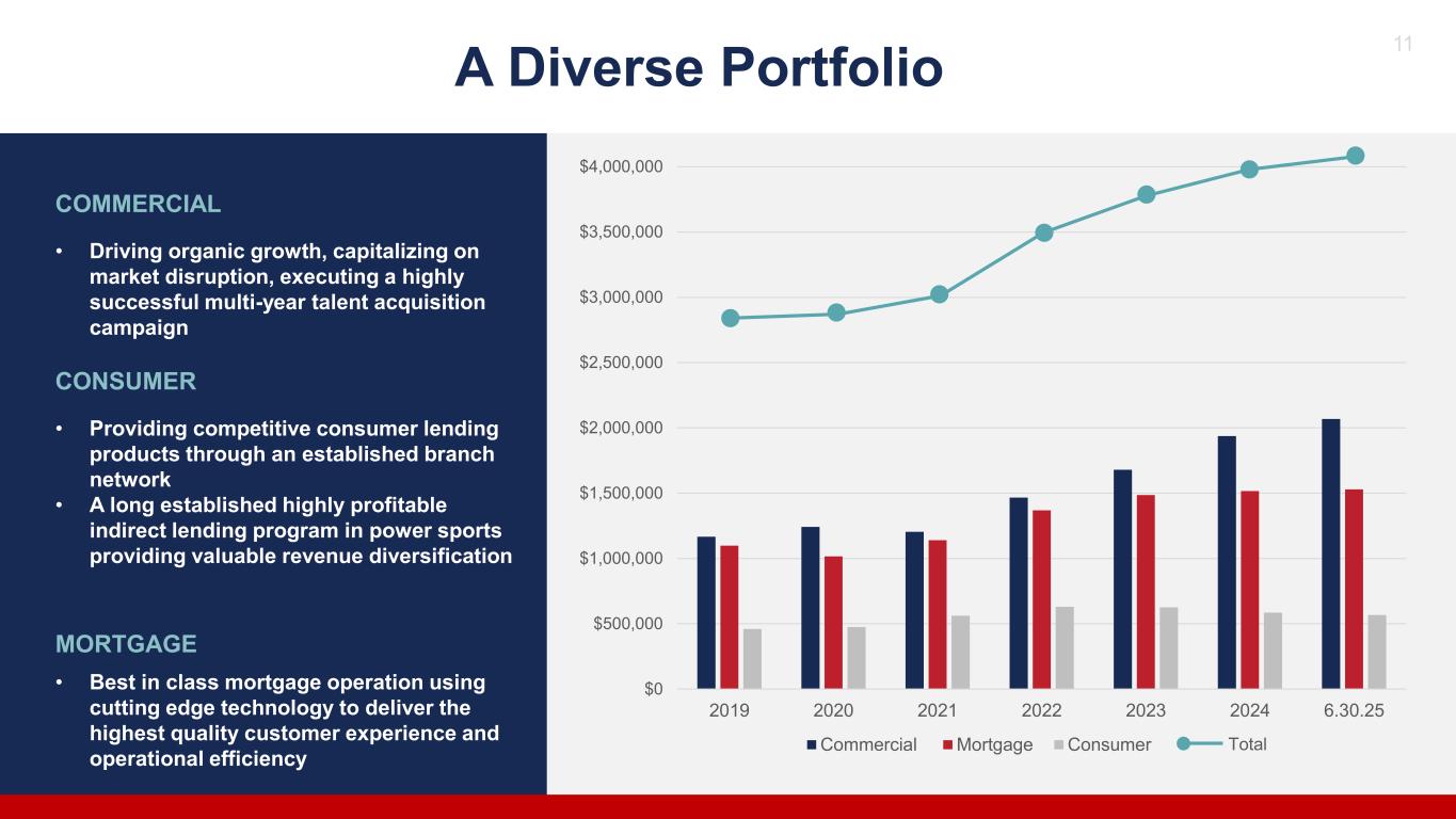 10Franchise Highlights • Highly profitable franchise built upon the foundation of a low-cost deposit base and exceptional credit quality • Proven track record of strong performance has resulted in 12 consecutive years of dividend increases • Diverse revenue mix with non-interest income accounting for 28% of total revenue on average over the last ten years. • Focus on improving efficiencies and productivity has increased average deposits per branch from $25 million in 2011 to $80 million in 2025 • Increasing business investment in Michigan, addition of new banking talent, and expansion into higher growth markets expected to drive further increases in revenue and earnings 10