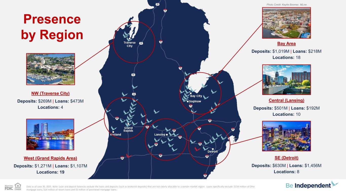 Data as of June 30, 2025. Note: Loan and deposit balances exclude the loans and deposits (such as brokered deposits) that are not clearly allocable to a certain market region. Loans specifically exclude: $216 million of Ohio mortgage loans, $24 million of resort loans and $5 million of purchased mortgage loans. SE (Detroit) Deposits: $630M | Loans: $1,456M Locations: 8 NW (Traverse City) Deposits: $269M | Loans: $473M Locations: 4 Bay Area Deposits: $1,019M | Loans: $218M Locations: 18 Central (Lansing) Deposits: $501M | Loans: $192M Locations: 10 West (Grand Rapids Area) Deposits: $1,271M | Loans: $1,107M Locations: 19 Presence by Region Photo Credit: Kaytie Boomer, MLive