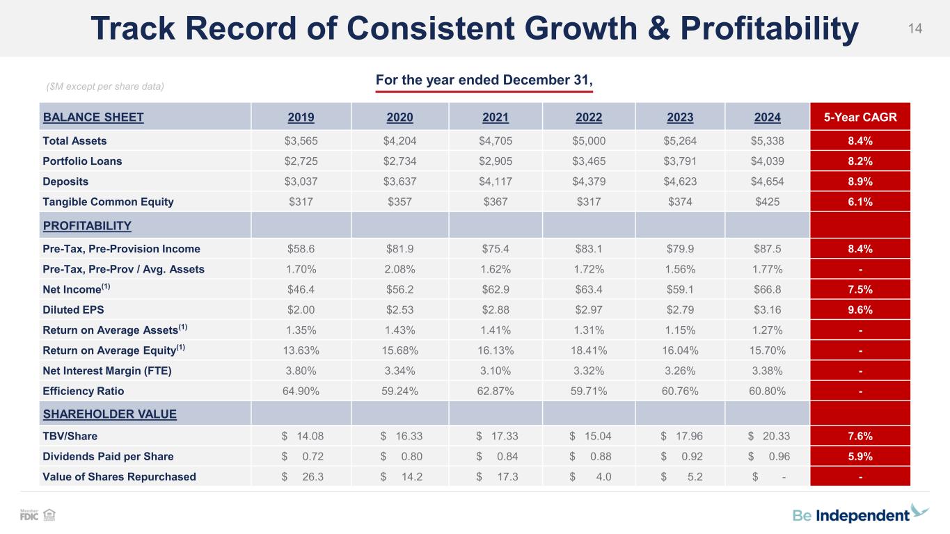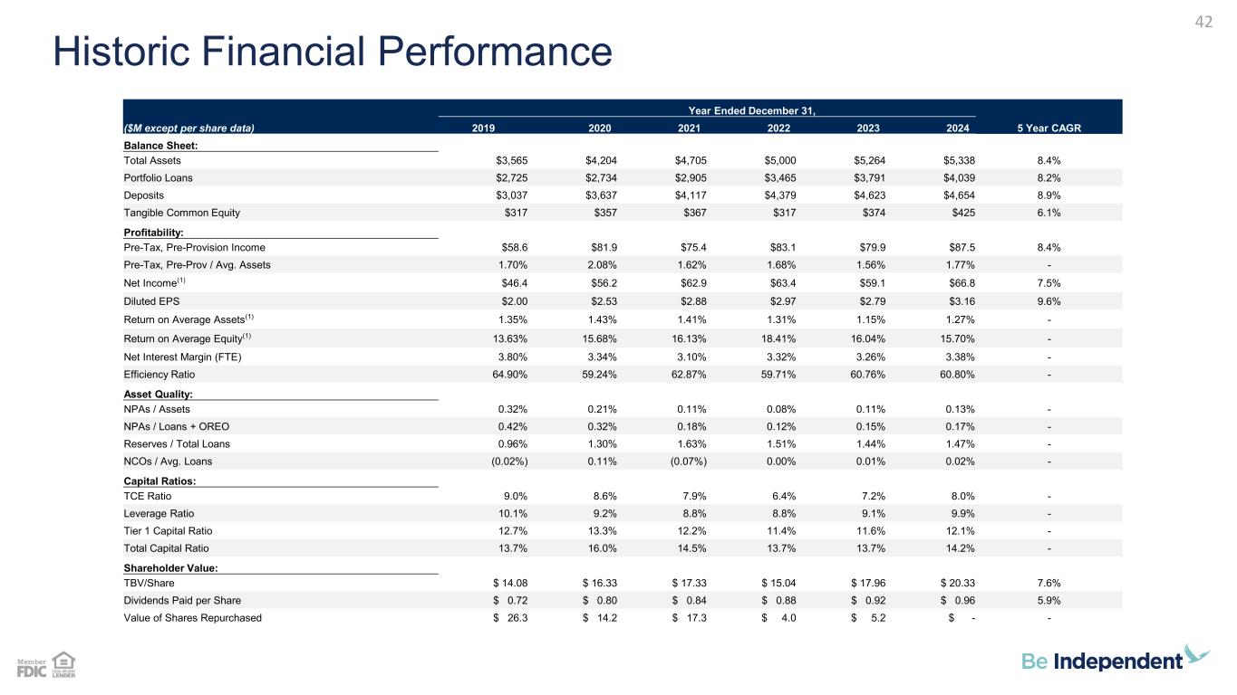 Historical Financial Data 41 here Year Ended December 31, Quarter Ended, ($M except per share data) 2021 2022 2023 2024 6/30/24 9/30/24 12/31/24 3/31/25 6/30/25 Balance Sheet: Total Assets $4,705 $5,000 $5,264 $5,338 $5,278 $5,259 $5,338 $5,328 $5,419 Portfolio Loans $2,905 $3,465 $3,791 $4,039 $3,852 $3,942 $4,039 $4,073 $4,164 Deposits $4,117 $4,379 $4,622 $4,654 $4,614 $4,627 $4,654 $4,634 $4,659 Tangible Common Equity $367 $317 $374 $425 $400 $422 $425 $438 $440 Profitability: Pre-Tax, Pre-Provision Income $75.4 $83.7 $79.9 $87.5 $23.2 $18.8 $25.0 $19.8 $22.2 Pre-Tax, Pre-Prov / Avg. Assets 1.69% 1.72% 1.56% 1.77% 1.80% 1.43% 1.88% 1.48% 1.67% Net Income(1) $62.9 $63.8 $59.1 $66.8 $18.5 $13.8 $18.5 $15.6 $16.9 Diluted EPS $2.88 $2.97 $2.79 $3.16 $0.88 $0.65 $0.87 $0.74 $0.81 Return on Average Assets(1) 1.41% 1.32% 1.15% 1.27% 1.44% 1.04% 1.39% 1.18% 1.27% Return on Average Equity(1) 16.1% 18.5% 16.0% 15.7% 18.0% 12.5% 16.3% 13.7% 14.7% Net Interest Margin (FTE) 3.10% 3.32% 3.26% 3.38% 3.40% 3.37% 3.45% 3.49% 3.58% Efficiency Ratio 62.9% 59.4% 60.8% 60.8% 61.5% 62.8% 59.1% 62.2% 59.7% Asset Quality: NPAs / Assets 0.11% 0.08% 0.11% 0.13% 0.10% 0.11% 0.13% 0.14% 0.16% NPAs / Loans + OREO 0.18% 0.12% 0.15% 0.17% 0.14% 0.15% 0.17% 0.18% 0.21% ACL / Total Portfolio Loans 1.63% 1.51% 1.44% 1.47% 1.46% 1.46% 1.47% 1.47% 1.47% NCOs / Avg. Loans (0.07%) 0.00% 0.01% 0.02% 0.02% 0.00% 0.01% 0.01% 0.02% Capital Ratios: TCE Ratio 7.9% 6.4% 7.2% 8.0% 7.6% 8.1% 8.0% 8.3% 8.2% Leverage Ratio 8.8% 8.8% 9.0% 9.9% 9.5% 9.6% 9.9% 9.9% 10.0% Tier 1 Capital Ratio 12.1% 11.4% 11.5% 12.1% 12.0% 12.1% 12.1% 12.3% 12.2% Total Capital Ratio 14.5% 13.7% 13.7% 14.2% 14.2% 14.2% 14.2% 14.5% 14.2%