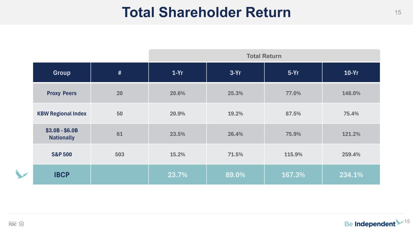15Total Shareholder Return Group # 1-Yr 3-Yr 5-Yr 10-Yr Proxy Peers 20 20.6% 25.3% 77.0% 148.0% KBW Regional Index 50 20.9% 19.2% 87.5% 75.4% $3.0B - $6.0B Nationally 61 23.5% 26.4% 75.9% 121.2% S&P 500 503 15.2% 71.5% 115.9% 259.4% IBCP 23.7% 89.0% 167.3% 234.1% 15 Total Return