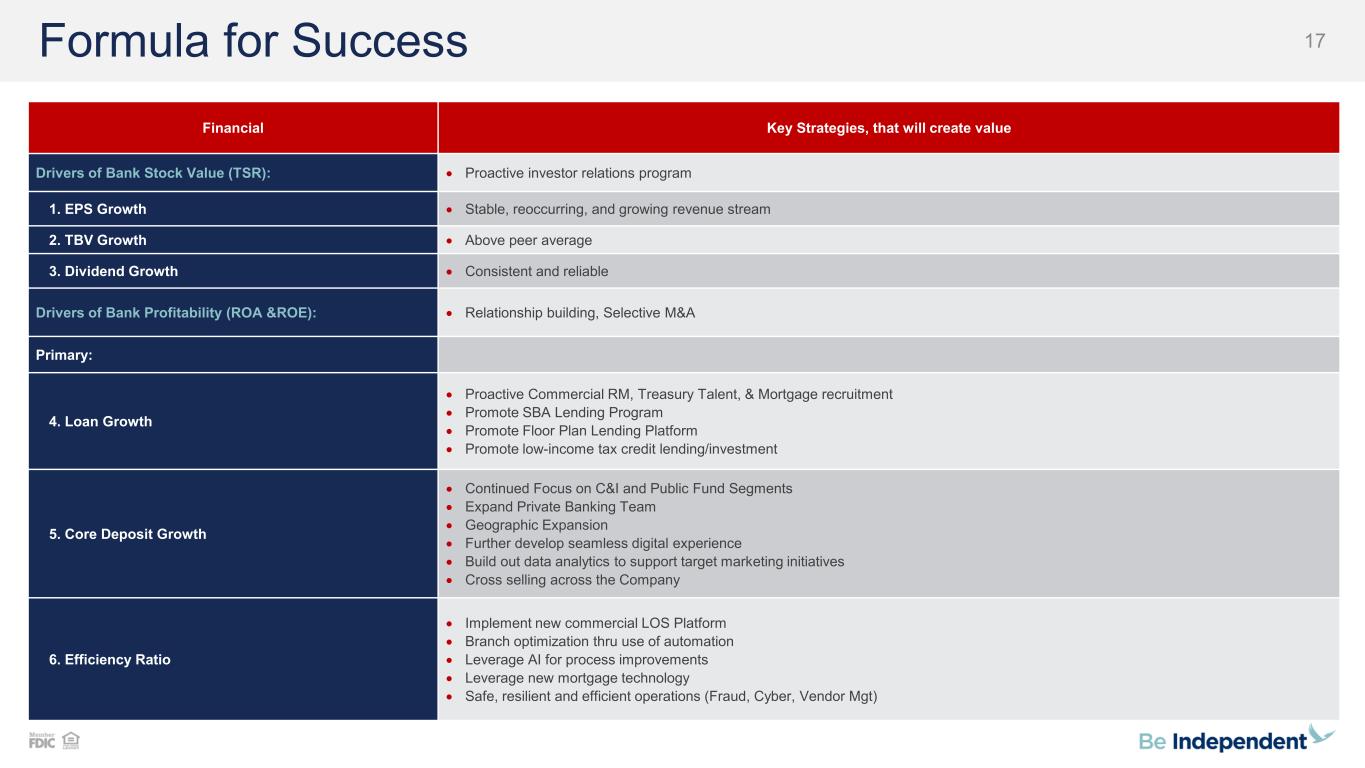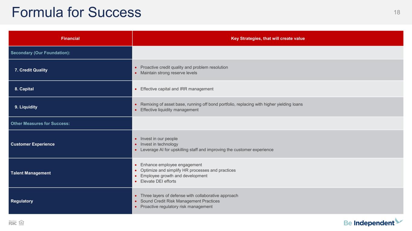 17Formula for Success Financial Key Strategies, that will create value Drivers of Bank Stock Value (TSR): • Proactive investor relations program 1. EPS Growth • Stable, reoccurring, and growing revenue stream 2. TBV Growth • Above peer average 3. Dividend Growth • Consistent and reliable Drivers of Bank Profitability (ROA &ROE): • Relationship building, Selective M&A Primary: 4. Loan Growth • Proactive Commercial RM, Treasury Talent, & Mortgage recruitment • Promote SBA Lending Program • Promote Floor Plan Lending Platform • Promote low-income tax credit lending/investment 5. Core Deposit Growth • Continued Focus on C&I and Public Fund Segments • Expand Private Banking Team • Geographic Expansion • Further develop seamless digital experience • Build out data analytics to support target marketing initiatives • Cross selling across the Company 6. Efficiency Ratio • Implement new commercial LOS Platform • Branch optimization thru use of automation • Leverage AI for process improvements • Leverage new mortgage technology • Safe, resilient and efficient operations (Fraud, Cyber, Vendor Mgt)