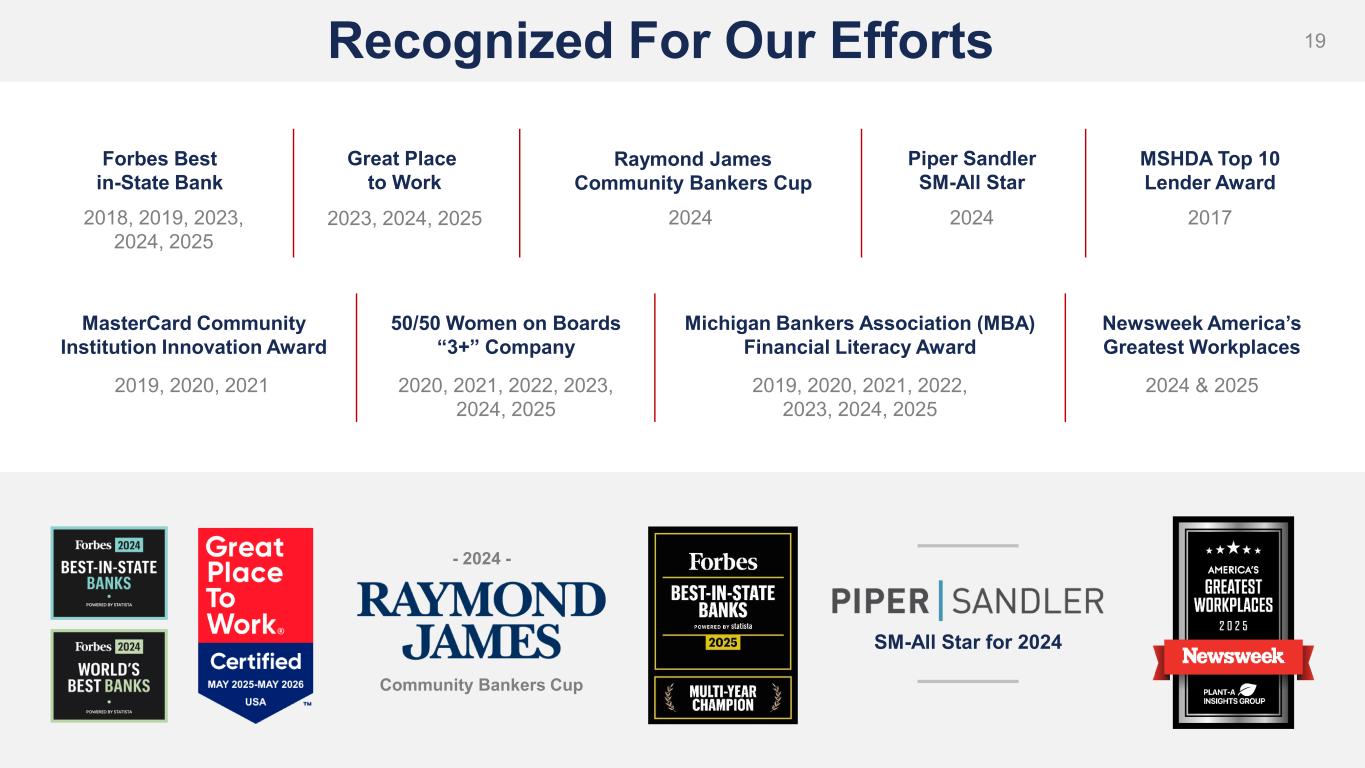 19Recognized For Our Efforts SM-All Star for 2024 Community Bankers Cup - 2024 - Forbes Best in-State Bank 2018, 2019, 2023, 2024, 2025 Great Place to Work 2023, 2024, 2025 Raymond James Community Bankers Cup 2024 Piper Sandler SM-All Star 2024 MSHDA Top 10 Lender Award 2017 MasterCard Community Institution Innovation Award 2019, 2020, 2021 50/50 Women on Boards “3+” Company 2020, 2021, 2022, 2023, 2024, 2025 Michigan Bankers Association (MBA) Financial Literacy Award 2019, 2020, 2021, 2022, 2023, 2024, 2025 Newsweek America’s Greatest Workplaces 2024 & 2025