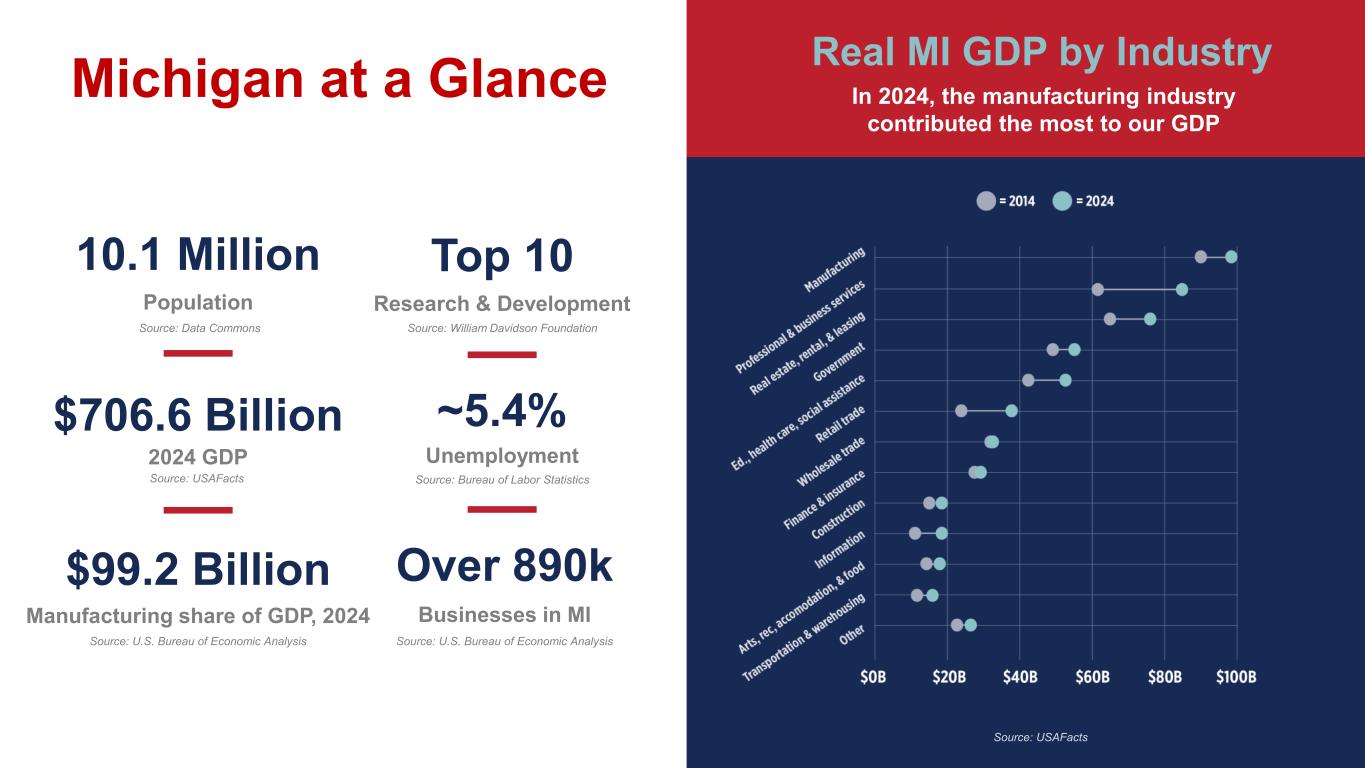 21 Michigan at a Glance 10.1 Million Population Top 10 Research & Development ~5.4% Unemployment Over 890k Businesses in MI $706.6 Billion 2024 GDP Source: USAFacts $99.2 Billion Manufacturing share of GDP, 2024 Source: U.S. Bureau of Economic Analysis Source: Bureau of Labor Statistics Source: William Davidson Foundation Source: U.S. Bureau of Economic Analysis Source: Data Commons In 2024, the manufacturing industry contributed the most to our GDP Real MI GDP by Industry Source: USAFacts