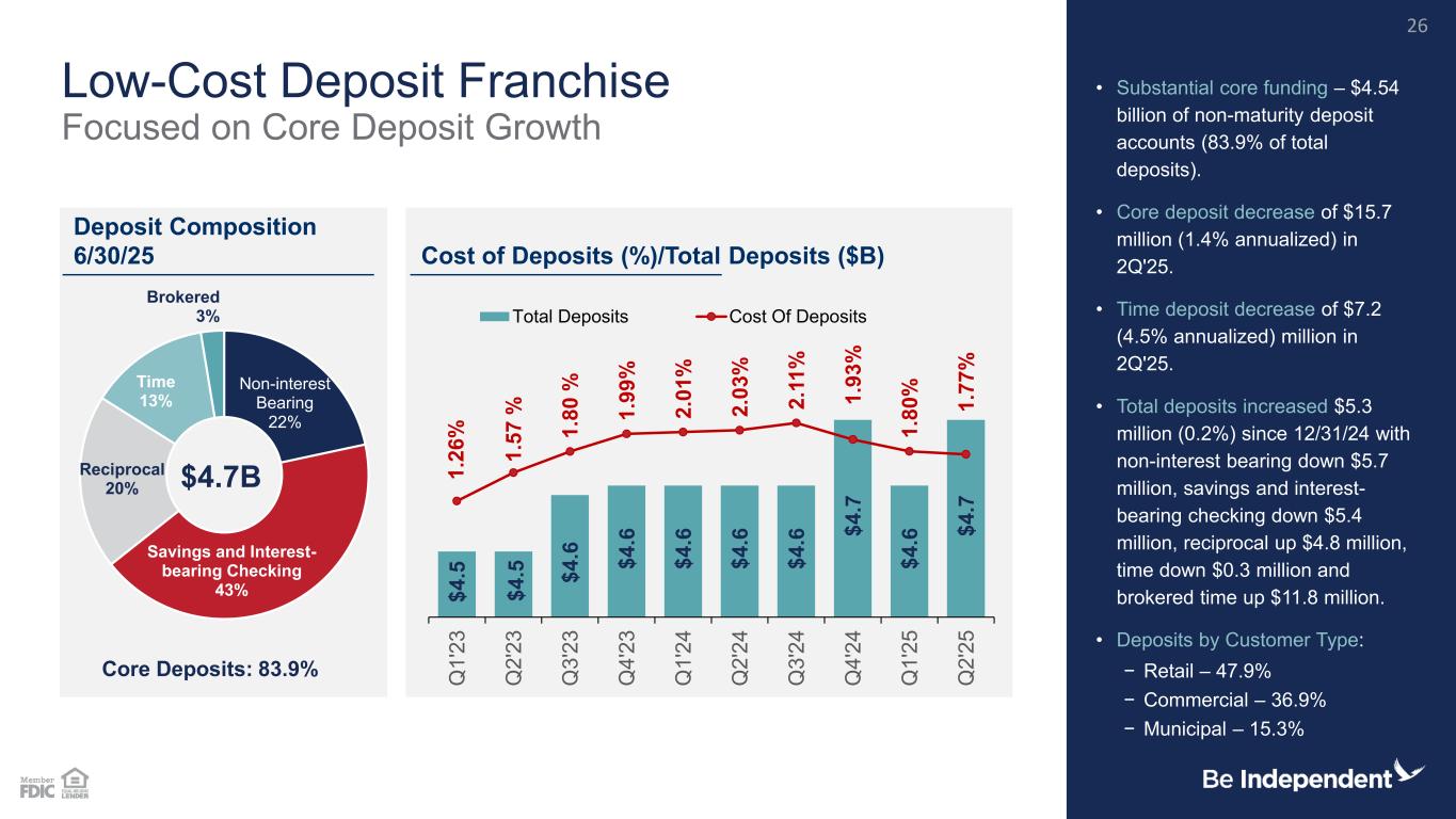 2Q'25 Overview • Total loans increased 9.0% annualized while maintaining a disciplined approach to new loan production • New loan production continues to be largely focused on new commercial clients that bring deposits to the bank • Asset quality remained exceptional with NPAs/Total Assets at 0.16% and NCO of 0.02% of average loans in the quarter • Generated a ROAA and ROAE of 1.27% and 14.66%, respectively • Net interest margin of 3.58% compared to 3.49% in the linked quarter • Commercial loan growth of 15.3% annualized • Efficiency ratio of 59.67% compared to 62.20% in the linked quarter • Tangible book value per share increased 6.9% annualized from end of prior quarter • An increase in all regulatory capital ratios compared to the prior year quarter • Balance sheet liquidity remains strong with loan-to-deposit ratio of 89% • Net income of $16.9 million, or $0.81 per diluted share • Increase in net interest income of $3.3 million over the prior year quarter and $0.9 million over the first quarter of 2025 • Strong profitability and prudent balance sheet management results 10.8% growth in tangible book value per share compared to the prior year quarter. Healthy Capital & Liquidity Positions Positive Trends in Key Metrics Solid Loan Growth and Strong Asset Quality 2Q'25 Earnings 25 25
