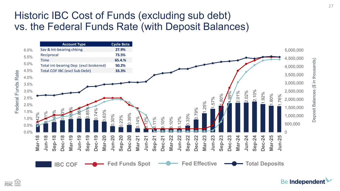 0 .4 2 % 0 .5 1 % 0 .6 0 % 0 .7 3 % 0 .8 2 % 0 .8 5 % 0 .8 5 % 0 .7 4 % 0 .6 3 % 0 .3 0 % 0 .2 3 % 0 .3 9 % 0 .1 4 % 0 .1 2 % 0 .1 1 % 0 .1 0 % 0 .1 0 % 0 .1 2 % 0 .3 3 % 0 .7 9 % 1 .2 5 % 1 .5 7 % 1 .8 0 % 1 .9 9 % 2 .0 1 % 2 .0 2 % 2 .1 0 % 1 .9 2 % 1 .8 0 % 1 .7 6 % 0 500,000 1,000,000 1,500,000 2,000,000 2,500,000 3,000,000 3,500,000 4,000,000 4,500,000 5,000,000 0.0% 0.5% 1.0% 1.5% 2.0% 2.5% 3.0% 3.5% 4.0% 4.5% 5.0% 5.5% 6.0% M a r- 1 8 J u n -1 8 S e p -1 8 D e c -1 8 M a r- 1 9 J u n -1 9 S e p -1 9 D e c -1 9 M a r- 2 0 J u n -2 0 S e p -2 0 D e c -2 0 M a r- 2 1 J u n -2 1 S e p -2 1 D e c -2 1 M a r- 2 2 J u n -2 2 S e p -2 2 D e c -2 2 M a r- 2 3 J u n -2 3 S e p -2 3 D e c -2 3 M a r- 2 4 J u n -2 4 S e p -2 4 D e c -2 4 M a r- 2 5 J u n -2 5 Historic IBC Cost of Funds (excluding sub debt) vs. the Federal Funds Rate (with Deposit Balances) D e p o s it B a la n c e s ( $ i n t h o u s a n d s ) 27 F e d e ra l F u n d s R a te Account Type Cycle Beta Sav & Int-bearing chking 27.9% Reciprocal 73.5% Time 65.4.% Total int-bearing Dep (excl brokered) 50.2% Total COF IBC (excl Sub Debt) 33.3% IBC COF Fed Funds Spot Fed Effective Total Deposits