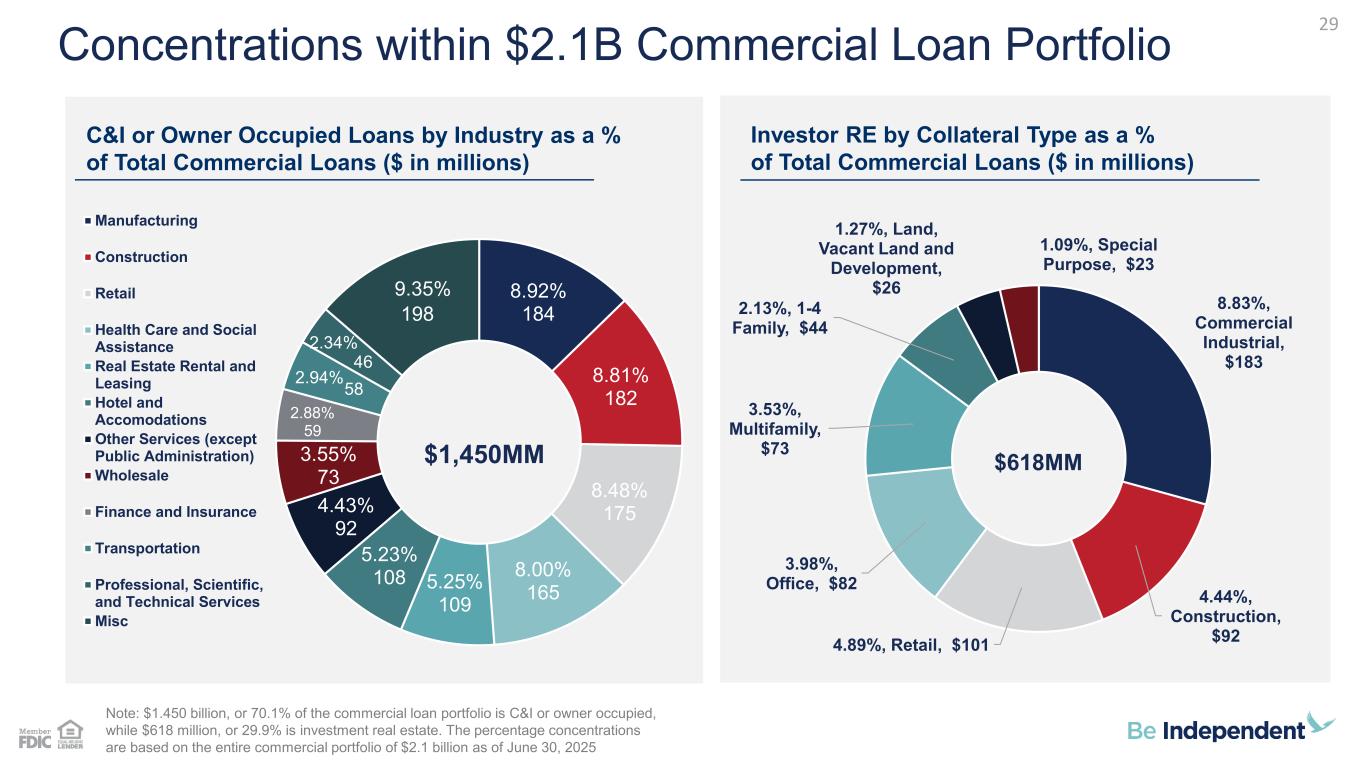 8.83%, Commercial Industrial, $183 4.44%, Construction, $92 4.89%, Retail, $101 3.98%, Office, $82 3.53%, Multifamily, $73 2.13%, 1-4 Family, $44 1.27%, Land, Vacant Land and Development, $26 1.09%, Special Purpose, $23 Concentrations within $2.1B Commercial Loan Portfolio C&I or Owner Occupied Loans by Industry as a % of Total Commercial Loans ($ in millions) Investor RE by Collateral Type as a % of Total Commercial Loans ($ in millions) Note: $1.450 billion, or 70.1% of the commercial loan portfolio is C&I or owner occupied, while $618 million, or 29.9% is investment real estate. The percentage concentrations are based on the entire commercial portfolio of $2.1 billion as of June 30, 2025 29 $618MM 8.92% 184 8.81% 182 8.48% 175 8.00% 165 5.25% 109 5.23% 108 4.43% 92 3.55% 73 2.88% 59 58 46 198 $1,450MM Manufacturing Construction Retail Health Care and Social Assistance Real Estate Rental and Leasing Hotel and Accomodations Other Services (except Public Administration) Wholesale Finance and Insurance Transportation Professional, Scientific, and Technical Services Misc 2.34% 9.35% 2.94%