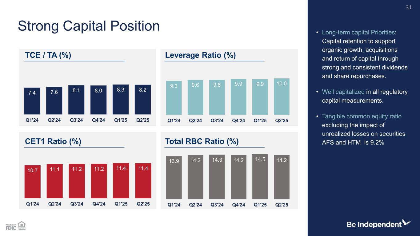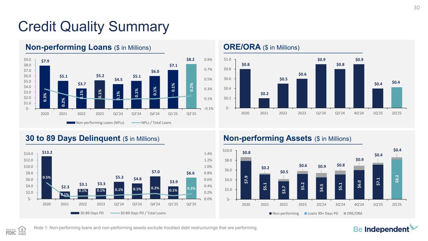 $ 7 .9 $ 5 .1 $ 3 .7 $ 5 .2 $ 4 .5 $ 5 .1 $ 6 .0 $ 7 .1 $ 8 .2 $0.8 $0.2 $0.5 $0.6 $0.9 $0.8 $0.9 $0.4 $0.4 $- $2.0 $4.0 $6.0 $8.0 $10.0 2020 2021 2022 2023 2Q'24 3Q'24 4Q'24 1Q'25 2Q'25 Non-performing Loans 90+ Days PD ORE/ORA $13.2 $2.3 $3.1 $3.3 $5.3 $4.8 $7.0 $3.9 $6.6 0.5% 0.1% 0.1% 0.1% 0.1% 0.1% 0.2% 0.1% 0.2% 0.0% 0.2% 0.4% 0.6% 0.8% 1.0% 1.2% 1.4% $- $2.0 $4.0 $6.0 $8.0 $10.0 $12.0 $14.0 2020 2021 2022 2023 Q2'24 Q3'24 Q4'24 Q1'25 Q2'25 30-89 Days PD 30-89 Days PD / Total Loans $0.8 $0.2 $0.5 $0.6 $0.9 $0.8 $0.9 $0.4 $0.4 $- $0.2 $0.4 $0.6 $0.8 $1.0 2020 2021 2022 2023 Q2'24 Q3'24 4Q'24 1Q'25 2Q'25 $7.9 $5.1 $3.7 $5.2 $4.5 $5.1 $6.0 $7.1 $8.2 0 .3 % 0 .2 % 0 .1 % 0 .1 % 0 .1 % 0 .1 % 0 .1 % 0 .1 % 0 .2 % -0.1% 0.1% 0.3% 0.5% 0.7% 0.9% $- $1.0 $2.0 $3.0 $4.0 $5.0 $6.0 $7.0 $8.0 $9.0 2020 2021 2022 2023 Q2'24 Q3'24 Q4'24 Q1'25 Q2'25 Non-performing Loans (NPLs) NPLs / Total Loans Note 1: Non-performing loans and non-performing assets exclude troubled debt restructurings that are performing. Credit Quality Summary Non-performing Loans ($ in Millions) ORE/ORA ($ in Millions) 30 to 89 Days Delinquent ($ in Millions) Non-performing Assets ($ in Millions) 30