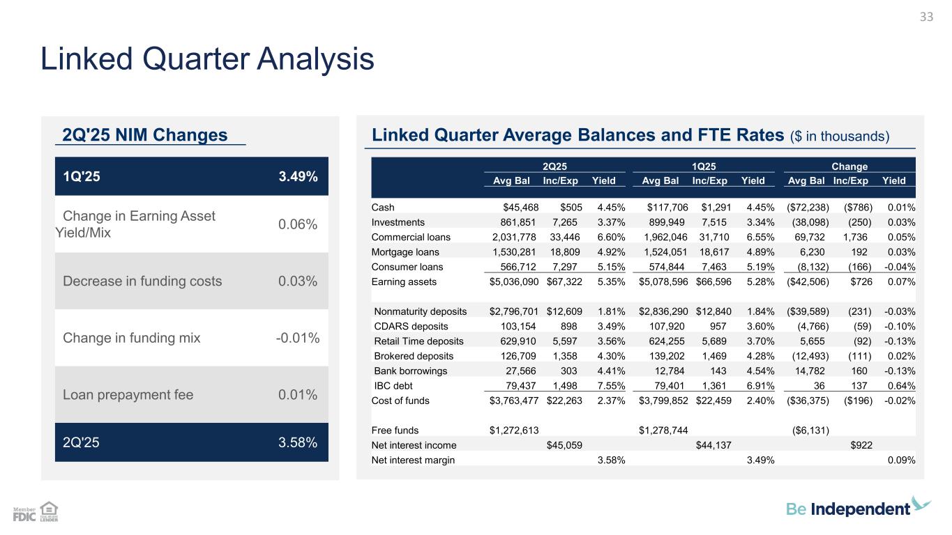 2Q25 1Q25 Change Avg Bal Inc/Exp Yield Avg Bal Inc/Exp Yield Avg Bal Inc/Exp Yield Cash $45,468 $505 4.45% $117,706 $1,291 4.45% ($72,238) ($786) 0.01% Investments 861,851 7,265 3.37% 899,949 7,515 3.34% (38,098) (250) 0.03% Commercial loans 2,031,778 33,446 6.60% 1,962,046 31,710 6.55% 69,732 1,736 0.05% Mortgage loans 1,530,281 18,809 4.92% 1,524,051 18,617 4.89% 6,230 192 0.03% Consumer loans 566,712 7,297 5.15% 574,844 7,463 5.19% (8,132) (166) -0.04% Earning assets $5,036,090 $67,322 5.35% $5,078,596 $66,596 5.28% ($42,506) $726 0.07% Nonmaturity deposits $2,796,701 $12,609 1.81% $2,836,290 $12,840 1.84% ($39,589) (231) -0.03% CDARS deposits 103,154 898 3.49% 107,920 957 3.60% (4,766) (59) -0.10% Retail Time deposits 629,910 5,597 3.56% 624,255 5,689 3.70% 5,655 (92) -0.13% Brokered deposits 126,709 1,358 4.30% 139,202 1,469 4.28% (12,493) (111) 0.02% Bank borrowings 27,566 303 4.41% 12,784 143 4.54% 14,782 160 -0.13% IBC debt 79,437 1,498 7.55% 79,401 1,361 6.91% 36 137 0.64% Cost of funds $3,763,477 $22,263 2.37% $3,799,852 $22,459 2.40% ($36,375) ($196) -0.02% Free funds $1,272,613 $1,278,744 ($6,131) Net interest income $45,059 $44,137 $922 Net interest margin 3.58% 3.49% 0.09% 1Q'25 3.49% Change in Earning Asset Yield/Mix 0.06% Decrease in funding costs 0.03% Change in funding mix -0.01% Loan prepayment fee 0.01% 2Q'25 3.58% 2Q'25 NIM Changes Linked Quarter Average Balances and FTE Rates ($ in thousands) Linked Quarter Analysis 33