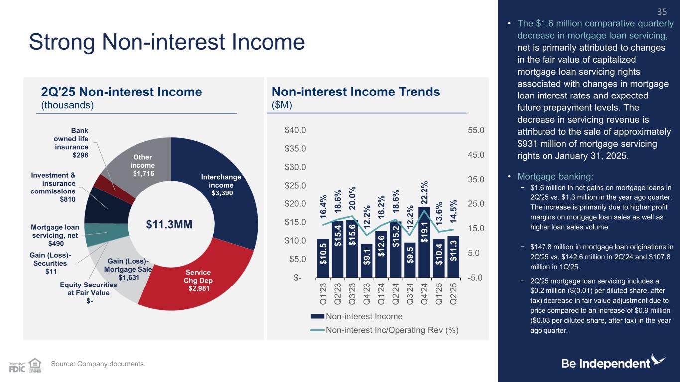 Interchange income $3,390 Service Chg Dep $2,981 Gain (Loss)- Mortgage Sale $1,631 Equity Securities at Fair Value $- Gain (Loss)- Securities $11 Mortgage loan servicing, net $490 Investment & insurance commissions $810 Bank owned life insurance $296 Other income $1,716 $ 1 0 .5 $ 1 5 .4 $ 1 5 .6 $ 9 .1 $ 1 2 .6 $ 1 5 .2 $ 9 .5 $ 1 9 .1 $ 1 0 .4 $ 1 1 .3 1 6 .4 % 1 8 .6 % 2 0 .0 % 1 2 .2 % 1 6 .2 % 1 8 .6 % 1 2 .2 % 2 2 .2 % 1 3 .6 % 1 4 .5 % -5.0 5.0 15.0 25.0 35.0 45.0 55.0 $- $5.0 $10.0 $15.0 $20.0 $25.0 $30.0 $35.0 $40.0 Q 1 '2 3 Q 2 '2 3 Q 3 '2 3 Q 4 '2 3 Q 1 '2 4 Q 2 '2 4 Q 3 '2 4 Q 4 '2 4 Q 1 '2 5 Q 2 '2 5 Non-interest Income Non-interest Inc/Operating Rev (%) Strong Non-interest Income • The $1.6 million comparative quarterly decrease in mortgage loan servicing, net is primarily attributed to changes in the fair value of capitalized mortgage loan servicing rights associated with changes in mortgage loan interest rates and expected future prepayment levels. The decrease in servicing revenue is attributed to the sale of approximately $931 million of mortgage servicing rights on January 31, 2025. • Mortgage banking: − $1.6 million in net gains on mortgage loans in 2Q'25 vs. $1.3 million in the year ago quarter. The increase is primarily due to higher profit margins on mortgage loan sales as well as higher loan sales volume. − $147.8 million in mortgage loan originations in 2Q'25 vs. $142.6 million in 2Q’24 and $107.8 million in 1Q'25. − 2Q'25 mortgage loan servicing includes a $0.2 million ($(0.01) per diluted share, after tax) decrease in fair value adjustment due to price compared to an increase of $0.9 million ($0.03 per diluted share, after tax) in the year ago quarter. Source: Company documents. 2Q'25 Non-interest Income (thousands) Non-interest Income Trends ($M) 35 $11.3MM