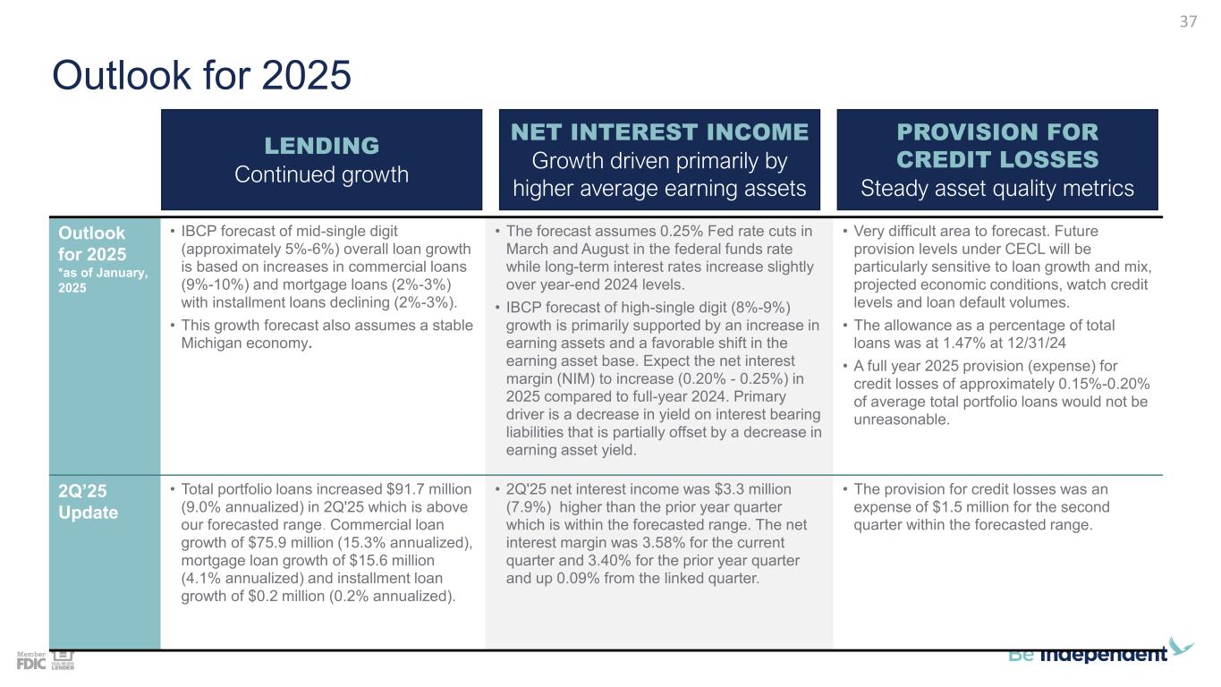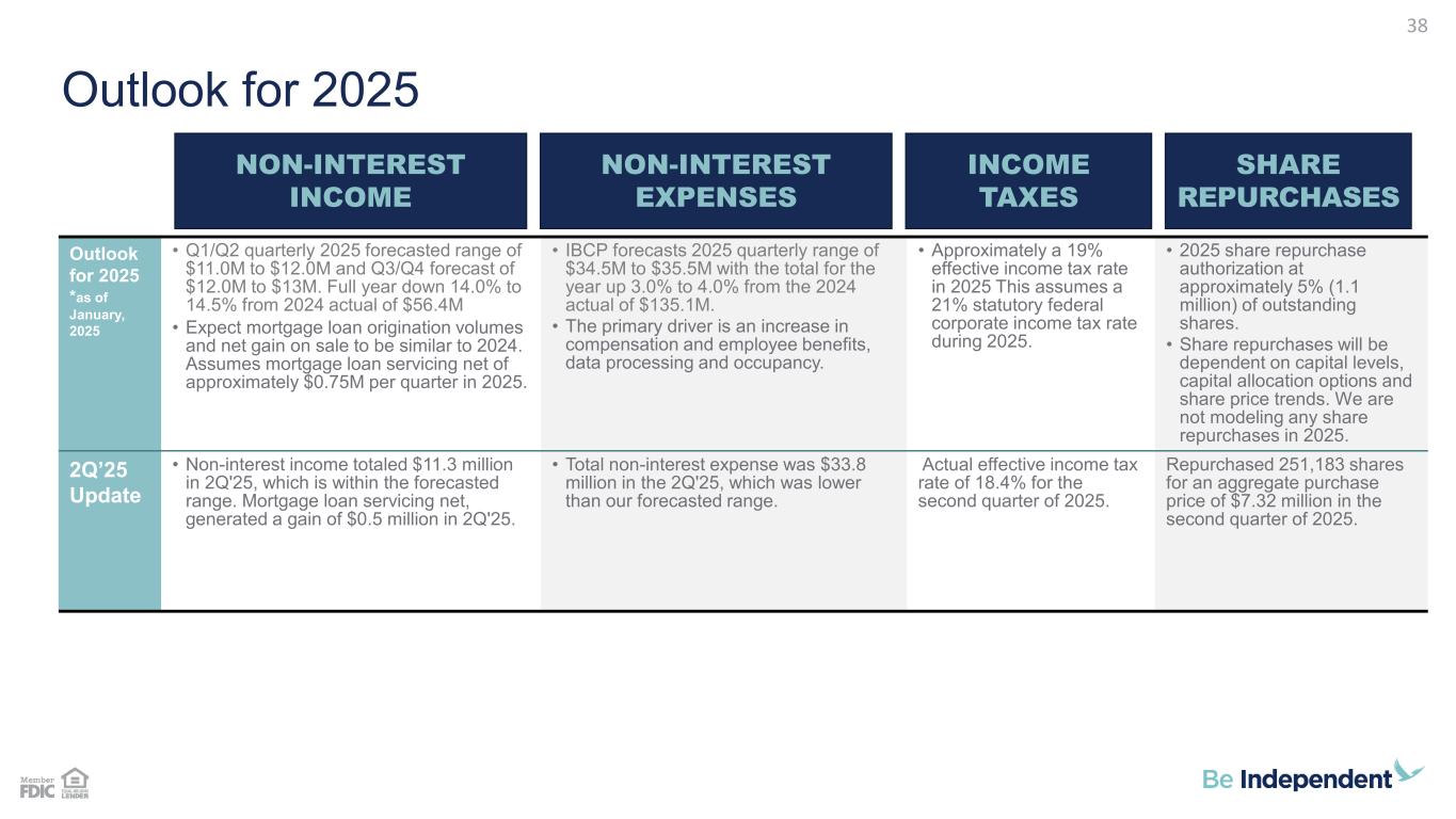 Outlook for 2025 Outlook for 2025 *as of January, 2025 • IBCP forecast of mid-single digit (approximately 5%-6%) overall loan growth is based on increases in commercial loans (9%-10%) and mortgage loans (2%-3%) with installment loans declining (2%-3%). • This growth forecast also assumes a stable Michigan economy. • The forecast assumes 0.25% Fed rate cuts in March and August in the federal funds rate while long-term interest rates increase slightly over year-end 2024 levels. • IBCP forecast of high-single digit (8%-9%) growth is primarily supported by an increase in earning assets and a favorable shift in the earning asset base. Expect the net interest margin (NIM) to increase (0.20% - 0.25%) in 2025 compared to full-year 2024. Primary driver is a decrease in yield on interest bearing liabilities that is partially offset by a decrease in earning asset yield. • Very difficult area to forecast. Future provision levels under CECL will be particularly sensitive to loan growth and mix, projected economic conditions, watch credit levels and loan default volumes. • The allowance as a percentage of total loans was at 1.47% at 12/31/24 • A full year 2025 provision (expense) for credit losses of approximately 0.15%-0.20% of average total portfolio loans would not be unreasonable. 2Q’25 Update • Total portfolio loans increased $91.7 million (9.0% annualized) in 2Q'25 which is above our forecasted range. Commercial loan growth of $75.9 million (15.3% annualized), mortgage loan growth of $15.6 million (4.1% annualized) and installment loan growth of $0.2 million (0.2% annualized). • 2Q'25 net interest income was $3.3 million (7.9%) higher than the prior year quarter which is within the forecasted range. The net interest margin was 3.58% for the current quarter and 3.40% for the prior year quarter and up 0.09% from the linked quarter. • The provision for credit losses was an expense of $1.5 million for the second quarter within the forecasted range. LENDING Continued growth NET INTEREST INCOME Growth driven primarily by higher average earning assets PROVISION FOR CREDIT LOSSES Steady asset quality metrics 37