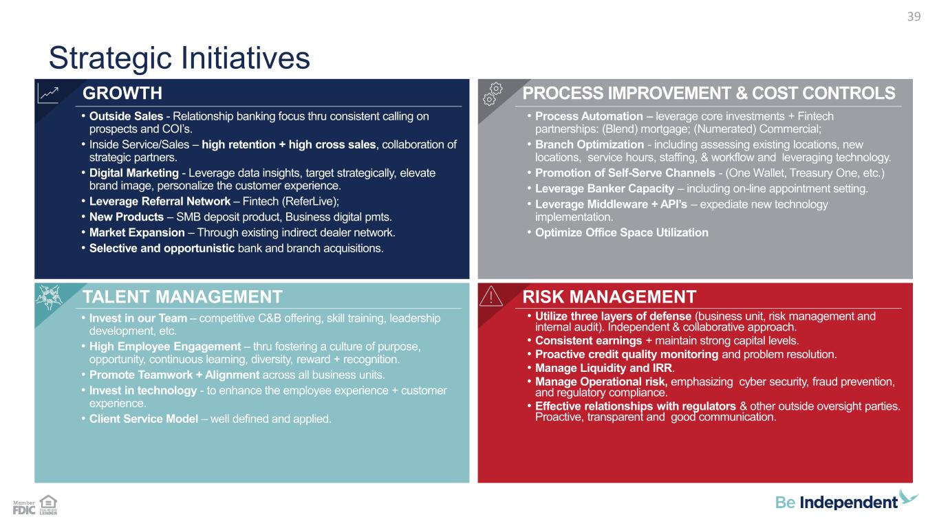 Strategic Initiatives • Outside Sales - Relationship banking focus thru consistent calling on prospects and COI’s. • Inside Service/Sales – high retention + high cross sales, collaboration of strategic partners. • Digital Marketing - Leverage data insights, target strategically, elevate brand image, personalize the customer experience. • Leverage Referral Network – Fintech (ReferLive); • New Products – SMB deposit product, Business digital pmts. • Market Expansion – Through existing indirect dealer network. • Selective and opportunistic bank and branch acquisitions. • Process Automation – leverage core investments + Fintech partnerships: (Blend) mortgage; (Numerated) Commercial; • Branch Optimization - including assessing existing locations, new locations, service hours, staffing, & workflow and leveraging technology. • Promotion of Self-Serve Channels - (One Wallet, Treasury One, etc.) • Leverage Banker Capacity – including on-line appointment setting. • Leverage Middleware + API’s – expediate new technology implementation. • Optimize Office Space Utilization • Invest in our Team – competitive C&B offering, skill training, leadership development, etc. • High Employee Engagement – thru fostering a culture of purpose, opportunity, continuous learning, diversity, reward + recognition. • Promote Teamwork + Alignment across all business units. • Invest in technology - to enhance the employee experience + customer experience. • Client Service Model – well defined and applied. • Utilize three layers of defense (business unit, risk management and internal audit). Independent & collaborative approach. • Consistent earnings + maintain strong capital levels. • Proactive credit quality monitoring and problem resolution. • Manage Liquidity and IRR. • Manage Operational risk, emphasizing cyber security, fraud prevention, and regulatory compliance. • Effective relationships with regulators & other outside oversight parties. Proactive, transparent and good communication. PROCESS IMPROVEMENT & COST CONTROLS RISK MANAGEMENT GROWTH TALENT MANAGEMENT 39