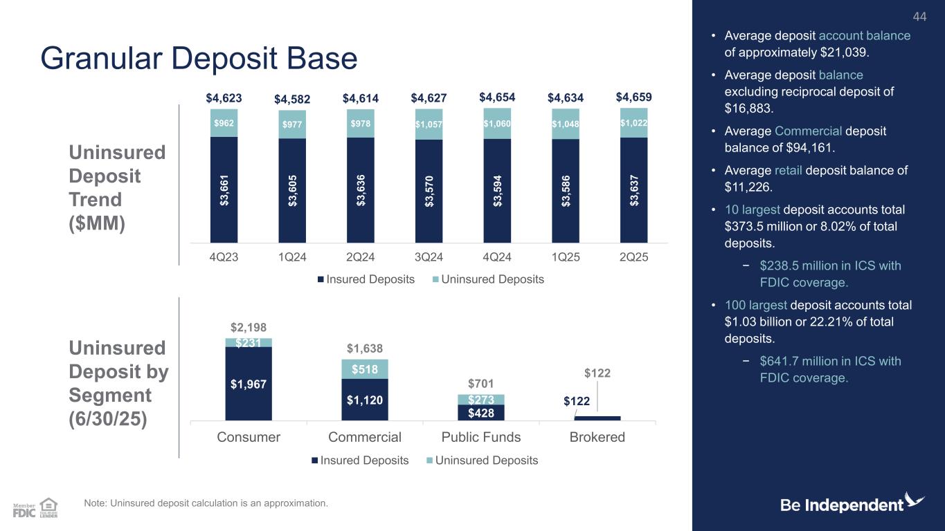 Sources of Liquidity 2Q 2025 Current On-balance sheet Excess reserves at the Fed $ 71.8 Unpledged AFS Securities $ 503.6 Total On-balance sheet $ 575.4 On balance sheet liquidity to total deposits 14% Available Sources of Liquidity Unused FHLB & FRB (including BTFP) $ 1,504.0 Borrow capacity on unpledged bonds $ 455.9 Total Available Sources $ 1,959.9 Sources of Liquidity to total deposits 42% 79% 74% 76% 60% 58% 56% 56% 2 3 7 % 2 3 8 % 2 2 2 % 2 1 8 % 1 9 5 % 1 9 6 % 1 9 1 .8 % 4Q23 1Q24 2Q24 3Q24 4Q24 1Q25 2Q25 On-balance sheet / Uninsured Deposits Available Sources / Uninsured Deposits Note: Portfolio loans exclude loans HFS. Liquidity / Uninsured Deposits Strong Liquidity Position • Significant liquidity position to manage the current environment. • Total available liquidity significantly exceeds (192%) estimated uninsured deposit balances. • Attractive loan to deposit ratio of 89.4%. • Uninsured deposit to total deposits of approximately 21.9%, excluding brokered time deposits. Sources of Liquidity 43