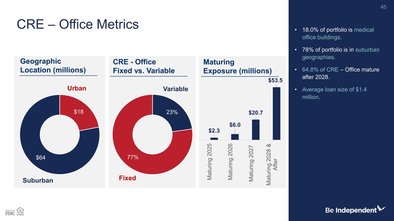 $1,967 $1,120 $428 $122 $231 $518 $273 $2,198 $1,638 $701 $122 Consumer Commercial Public Funds Brokered Insured Deposits Uninsured Deposits $ 3 ,6 6 1 $ 3 ,6 0 5 $ 3 ,6 3 6 $ 3 ,5 7 0 $ 3 ,5 9 4 $ 3 ,5 8 6 $ 3 ,6 3 7 $962 $977 $978 $1,057 $1,060 $1,048 $1,022 $4,623 $4,582 $4,614 $4,627 $4,654 $4,634 $4,659 4Q23 1Q24 2Q24 3Q24 4Q24 1Q25 2Q25 Insured Deposits Uninsured Deposits Granular Deposit Base • Average deposit account balance of approximately $21,039. • Average deposit balance excluding reciprocal deposit of $16,883. • Average Commercial deposit balance of $94,161. • Average retail deposit balance of $11,226. • 10 largest deposit accounts total $373.5 million or 8.02% of total deposits. − $238.5 million in ICS with FDIC coverage. • 100 largest deposit accounts total $1.03 billion or 22.21% of total deposits. − $641.7 million in ICS with FDIC coverage. Note: Uninsured deposit calculation is an approximation. Uninsured Deposit by Segment (6/30/25) Uninsured Deposit Trend ($MM) 44