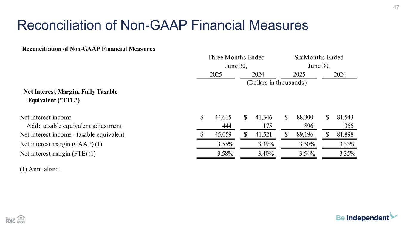 Reconciliation of Non-GAAP Financial Measures 47 Reconciliation of Non-GAAP Financial Measures 2025 2024 2025 2024 Net Interest Margin, Fully Taxable Equivalent ("FTE") Net interest income 44,615$ 41,346$ 88,300$ 81,543$ Add: taxable equivalent adjustment 444 175 896 355 Net interest income - taxable equivalent 45,059$ 41,521$ 89,196$ 81,898$ Net interest margin (GAAP) (1) 3.55% 3.39% 3.50% 3.33% Net interest margin (FTE) (1) 3.58% 3.40% 3.54% 3.35% (1) Annualized. Three Months Ended Six Months Ended June 30, June 30, (Dollars in thousands)