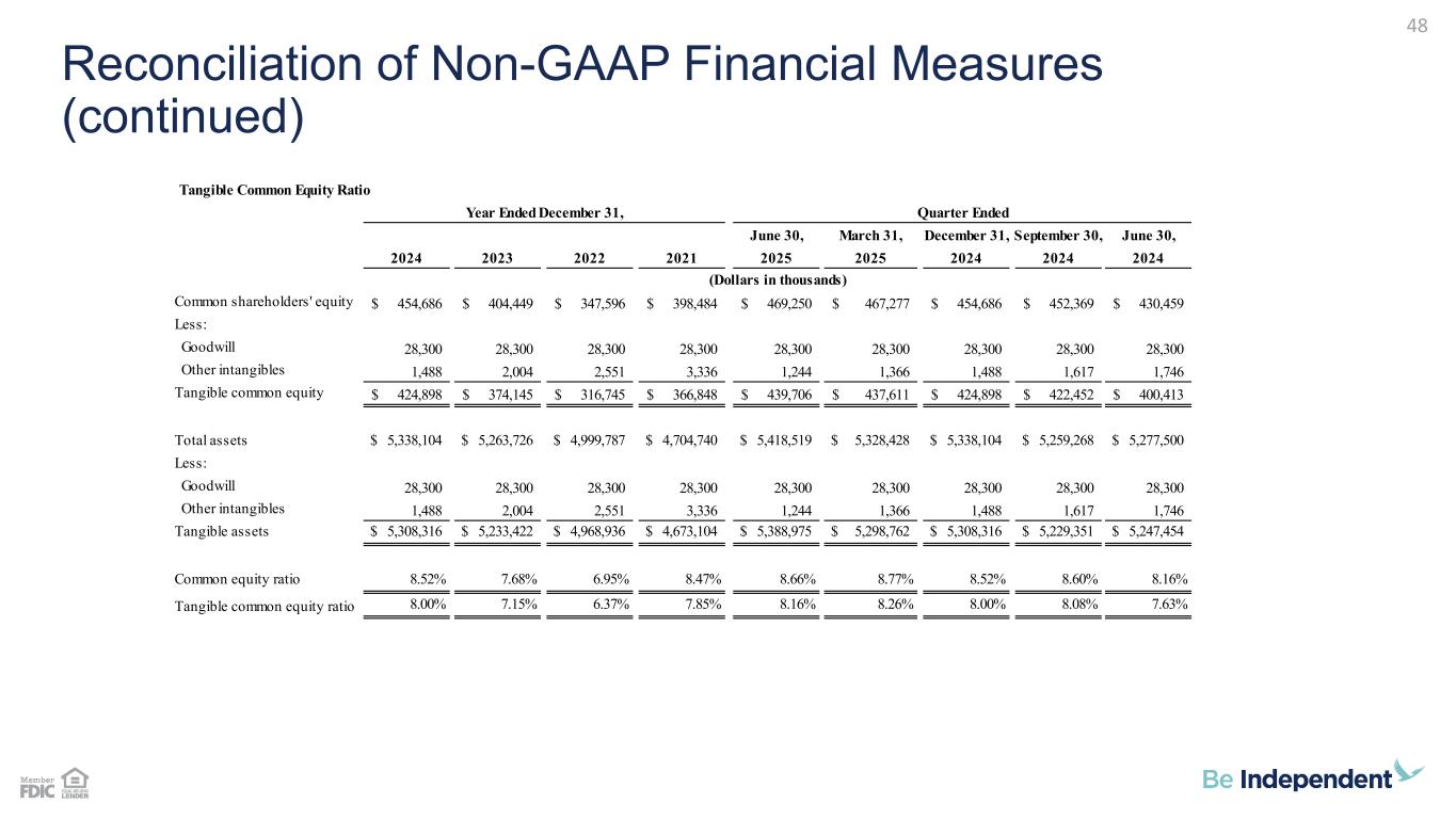 Reconciliation of Non-GAAP Financial Measures (continued) 48 Tangible Common Equity Ratio June 30, March 31, December 31, September 30, June 30, 2024 2023 2022 2021 2025 2025 2024 2024 2024 Common shareholders' equity 454,686$ 404,449$ 347,596$ 398,484$ 469,250$ 467,277$ 454,686$ 452,369$ 430,459$ Less: Goodwill 28,300 28,300 28,300 28,300 28,300 28,300 28,300 28,300 28,300 Other intangibles 1,488 2,004 2,551 3,336 1,244 1,366 1,488 1,617 1,746 Tangible common equity 424,898$ 374,145$ 316,745$ 366,848$ 439,706$ 437,611$ 424,898$ 422,452$ 400,413$ Total assets $ 5,338,104 $ 5,263,726 $ 4,999,787 $ 4,704,740 $ 5,418,519 $ 5,328,428 $ 5,338,104 $ 5,259,268 $ 5,277,500 Less: Goodwill 28,300 28,300 28,300 28,300 28,300 28,300 28,300 28,300 28,300 Other intangibles 1,488 2,004 2,551 3,336 1,244 1,366 1,488 1,617 1,746 Tangible assets $ 5,308,316 $ 5,233,422 $ 4,968,936 $ 4,673,104 $ 5,388,975 $ 5,298,762 $ 5,308,316 $ 5,229,351 $ 5,247,454 Common equity ratio 8.52% 7.68% 6.95% 8.47% 8.66% 8.77% 8.52% 8.60% 8.16% Tangible common equity ratio 8.00% 7.15% 6.37% 7.85% 8.16% 8.26% 8.00% 8.08% 7.63% Year Ended December 31, Quarter Ended (Dollars in thousands)