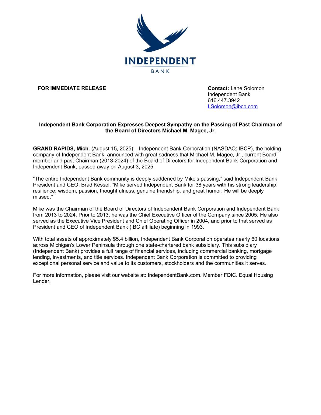 FOR IMMEDIATE RELEASE Contact: Lane Solomon Independent Bank 616.447.3942 LSolomon@ibcp.com Independent Bank Corporation Expresses Deepest Sympathy on the Passing of Past Chairman of the Board of Directors Michael M. Magee, Jr. GRAND RAPIDS, Mich. (August 15, 2025) – Independent Bank Corporation (NASDAQ: IBCP), the holding company of Independent Bank, announced with great sadness that Michael M. Magee, Jr., current Board member and past Chairman (2013-2024) of the Board of Directors for Independent Bank Corporation and Independent Bank, passed away on August 3, 2025. “The entire Independent Bank community is deeply saddened by Mike’s passing,” said Independent Bank President and CEO, Brad Kessel. “Mike served Independent Bank for 38 years with his strong leadership, resilience, wisdom, passion, thoughtfulness, genuine friendship, and great humor. He will be deeply missed.” Mike was the Chairman of the Board of Directors of Independent Bank Corporation and Independent Bank from 2013 to 2024. Prior to 2013, he was the Chief Executive Officer of the Company since 2005. He also served as the Executive Vice President and Chief Operating Officer in 2004, and prior to that served as President and CEO of Independent Bank (IBC affiliate) beginning in 1993. With total assets of approximately $5.4 billion, Independent Bank Corporation operates nearly 60 locations across Michigan’s Lower Peninsula through one state-chartered bank subsidiary. This subsidiary (Independent Bank) provides a full range of financial services, including commercial banking, mortgage lending, investments, and title services. Independent Bank Corporation is committed to providing exceptional personal service and value to its customers, stockholders and the communities it serves. For more information, please visit our website at: IndependentBank.com. Member FDIC. Equal Housing Lender.