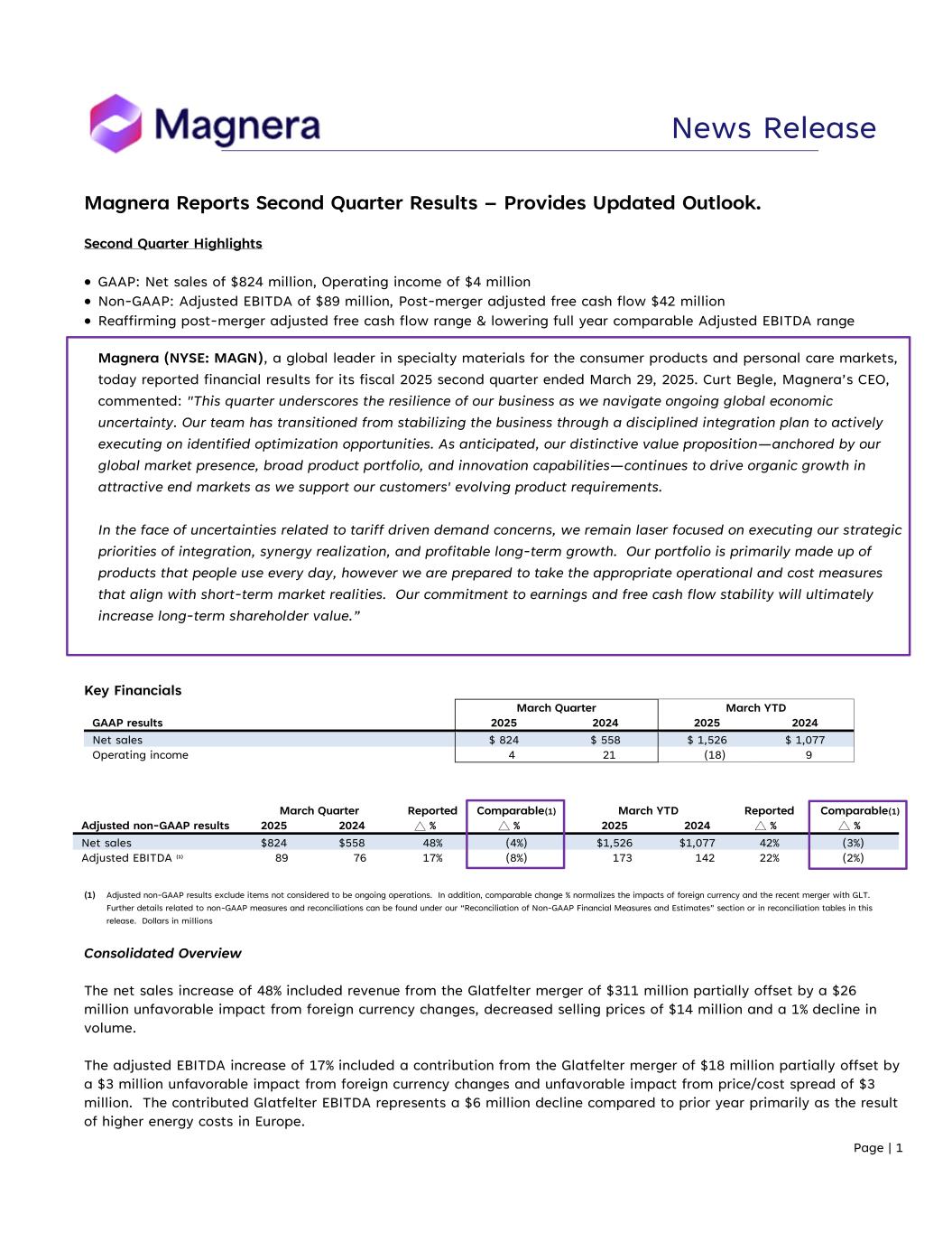 Page | 1 Magnera Reports Second Quarter Results – Provides Updated Outlook. Second Quarter Highlights GAAP: Net sales of $824 million, Operating income of $4 million Non-GAAP: Adjusted EBITDA of $89 million, Post-merger adjusted free cash flow $42 million Reaffirming post-merger adjusted free cash flow range & lowering full year comparable Adjusted EBITDA range Magnera (NYSE: MAGN), a global leader in specialty materials for the consumer products and personal care markets, today reported financial results for its fiscal 2025 second quarter ended March 29, 2025. Curt Begle, Magnera’s CEO, commented: "This quarter underscores the resilience of our business as we navigate ongoing global economic uncertainty. Our team has transitioned from stabilizing the business through a disciplined integration plan to actively executing on identified optimization opportunities. As anticipated, our distinctive value proposition—anchored by our global market presence, broad product portfolio, and innovation capabilities—continues to drive organic growth in attractive end markets as we support our customers' evolving product requirements. In the face of uncertainties related to tariff driven demand concerns, we remain laser focused on executing our strategic priorities of integration, synergy realization, and profitable long-term growth. Our portfolio is primarily made up of products that people use every day, however we are prepared to take the appropriate operational and cost measures that align with short-term market realities. Our commitment to earnings and free cash flow stability will ultimately increase long-term shareholder value.” Key Financials March Quarter March YTD GAAP results 2025 2024 2025 2024 Net sales $ 824 $ 558 $ 1,526 $ 1,077 Operating income 4 21 (18) 9 (1) Adjusted non-GAAP results exclude items not considered to be ongoing operations. In addition, comparable change % normalizes the impacts of foreign currency and the recent merger with GLT. Further details related to non-GAAP measures and reconciliations can be found under our “Reconciliation of Non-GAAP Financial Measures and Estimates” section or in reconciliation tables in this release. Dollars in millions Consolidated Overview The net sales increase of 48% included revenue from the Glatfelter merger of $311 million partially offset by a $26 million unfavorable impact from foreign currency changes, decreased selling prices of $14 million and a 1% decline in volume. The adjusted EBITDA increase of 17% included a contribution from the Glatfelter merger of $18 million partially offset by a $3 million unfavorable impact from foreign currency changes and unfavorable impact from price/cost spread of $3 million. The contributed Glatfelter EBITDA represents a $6 million decline compared to prior year primarily as the result of higher energy costs in Europe. March Quarter Reported Comparable(1) March YTD Reported Comparable(1) Adjusted non-GAAP results 2025 2024 % % 2025 2024 % % Net sales $824 $558 48% (4%) $1,526 $1,077 42% (3%) Adjusted EBITDA (1) 89 76 17% (8%) 173 142 22% (2%) News Release