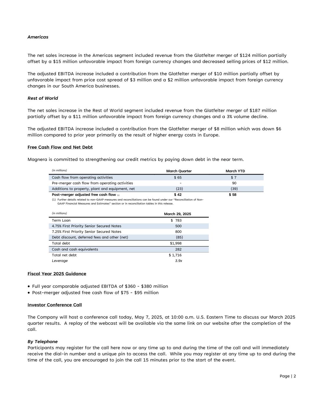 Page | 2 Americas The net sales increase in the Americas segment included revenue from the Glatfelter merger of $124 million partially offset by a $15 million unfavorable impact from foreign currency changes and decreased selling prices of $12 million. The adjusted EBITDA increase included a contribution from the Glatfelter merger of $10 million partially offset by unfavorable impact from price cost spread of $3 million and a $2 million unfavorable impact from foreign currency changes in our South America businesses. Rest of World The net sales increase in the Rest of World segment included revenue from the Glatfelter merger of $187 million partially offset by a $11 million unfavorable impact from foreign currency changes and a 3% volume decline. The adjusted EBITDA increase included a contribution from the Glatfelter merger of $8 million which was down $6 million compared to prior year primarily as the result of higher energy costs in Europe. Free Cash Flow and Net Debt Magnera is committed to strengthening our credit metrics by paying down debt in the near term. (in millions) March Quarter March YTD Cash flow from operating activities $ 65 $ 7 Pre-merger cash flow from operating activities - 90 Additions to property, plant and equipment, net (23) (39) Post-merger adjusted free cash flow (1) $ 42 $ 58 (1) Further details related to non-GAAP measures and reconciliations can be found under our “Reconciliation of Non- GAAP Financial Measures and Estimates” section or in reconciliation tables in this release. (in millions) March 29, 2025 Term Loan $ 783 4.75% First Priority Senior Secured Notes 500 7.25% First Priority Senior Secured Notes 800 Debt discount, deferred fees and other (net) (85) Total debt $1,998 Cash and cash equivalents 282 Total net debt $ 1,716 Leverage 3.9x Fiscal Year 2025 Guidance Full year comparable adjusted EBITDA of $360 - $380 million Post-merger adjusted free cash flow of $75 - $95 million Investor Conference Call The Company will host a conference call today, May 7, 2025, at 10:00 a.m. U.S. Eastern Time to discuss our March 2025 quarter results. A replay of the webcast will be available via the same link on our website after the completion of the call. By Telephone Participants may register for the call here now or any time up to and during the time of the call and will immediately receive the dial-in number and a unique pin to access the call. While you may register at any time up to and during the time of the call, you are encouraged to join the call 15 minutes prior to the start of the event.
