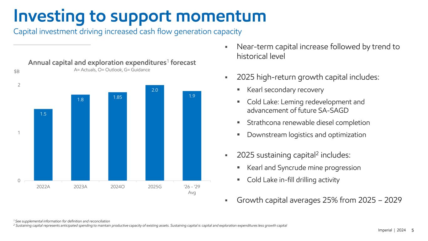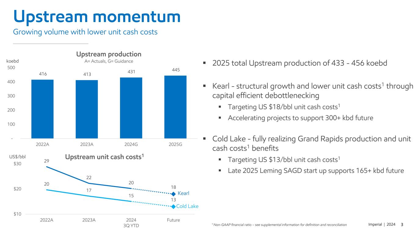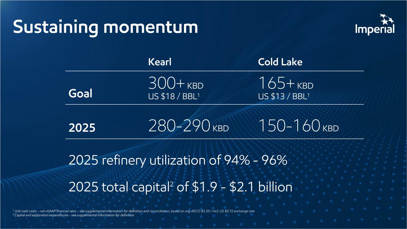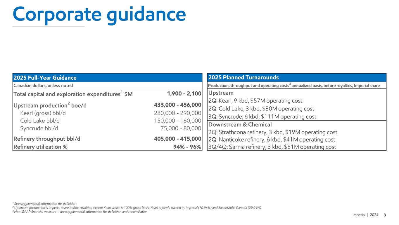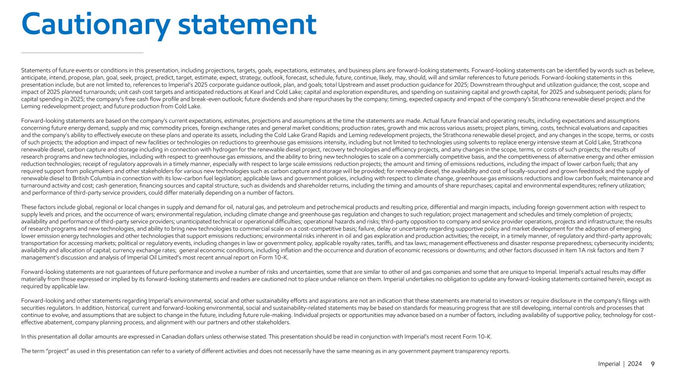 Statements of future events or conditions in this release, including projections, forecasts, targets, expectations, estimates, and business plans are forward-looking statements. Forward-looking statements can be identified by words such as believe, anticipate, intend, propose, plan, goal, seek, project, predict, target, estimate, expect, strategy, outlook, forecast, schedule, future, continue, likely, may, should, will and similar references to future periods. Forward-looking statements in this release include, but are not limited to, references to Imperial’s 2025 corporate guidance outlook and 2025 plan; total Upstream and asset production guidance for 2025; Downstream throughput and utilization guidance; the cost, scope and impact of 2025 planned turnarounds; the company’s corporate strategy remaining focused on maximizing existing assets, select growth initiatives and delivering returns to shareholders; the company’s focus on profitable volume growth, lowering costs and driving efficiencies including anticipated unit cash cost reductions at Kearl and Cold Lake; forecasted capital and exploration expenditures of $1.9 to $2.1 billion for 2025; the company’s ability to generate free cash flow and deliver value to shareholders, and focus on cost efficiencies; the impact and timing of investments at Kearl and Cold Lake to support volume growth, including Grand Rapids, the Leming redevelopment project, and high-value drilling opportunities at Cold Lake; timing and impact of the company’s Strathcona renewable diesel project; improvements to the company’s downstream business, including through efficient product transportation, refinery slate flexibility and further development of its lower-carbon product offering; and the company’s commitment to supplying secure, reliable and affordable energy including by reducing emissions intensity.