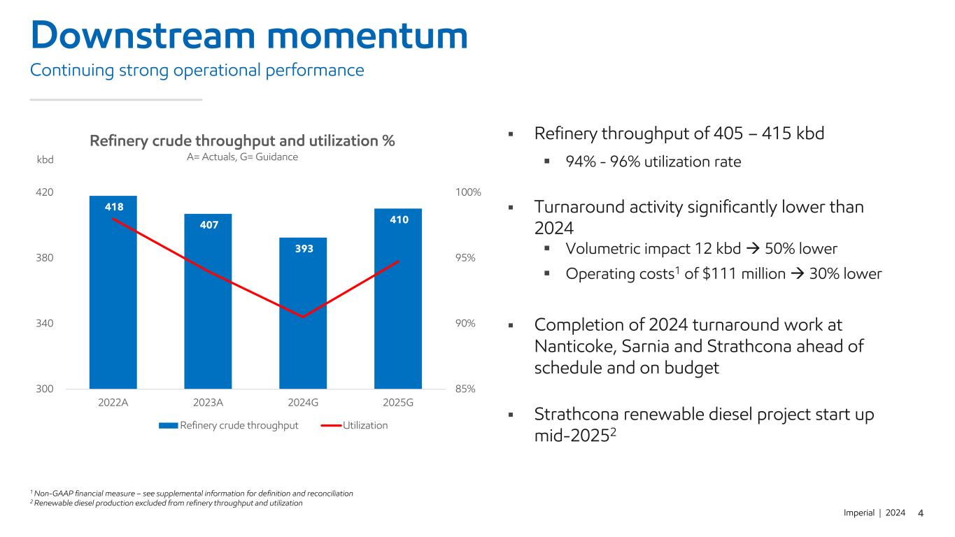 In the Downstream, throughput is forecasted to be between 405,000 and 415,000 barrels per day with capacity utilization between 94% and 96%. The company is planning turnarounds at each of its refineries in 2025, with lower expected impacts to throughput and costs compared to 2024. Imperial continues to focus on further improving its advantaged Canadian downstream business by leveraging its coast-to-coast logistics network to efficiently move product to high-value markets, maximizing refinery crude and product slate flexibility to improve resiliency and further developing its lower-carbon product offering to meet the needs of customers across Canada.