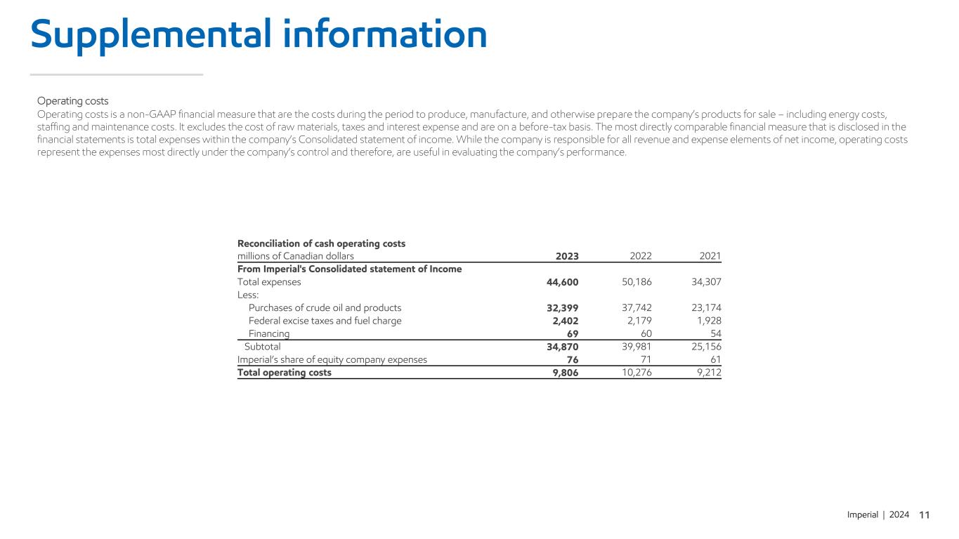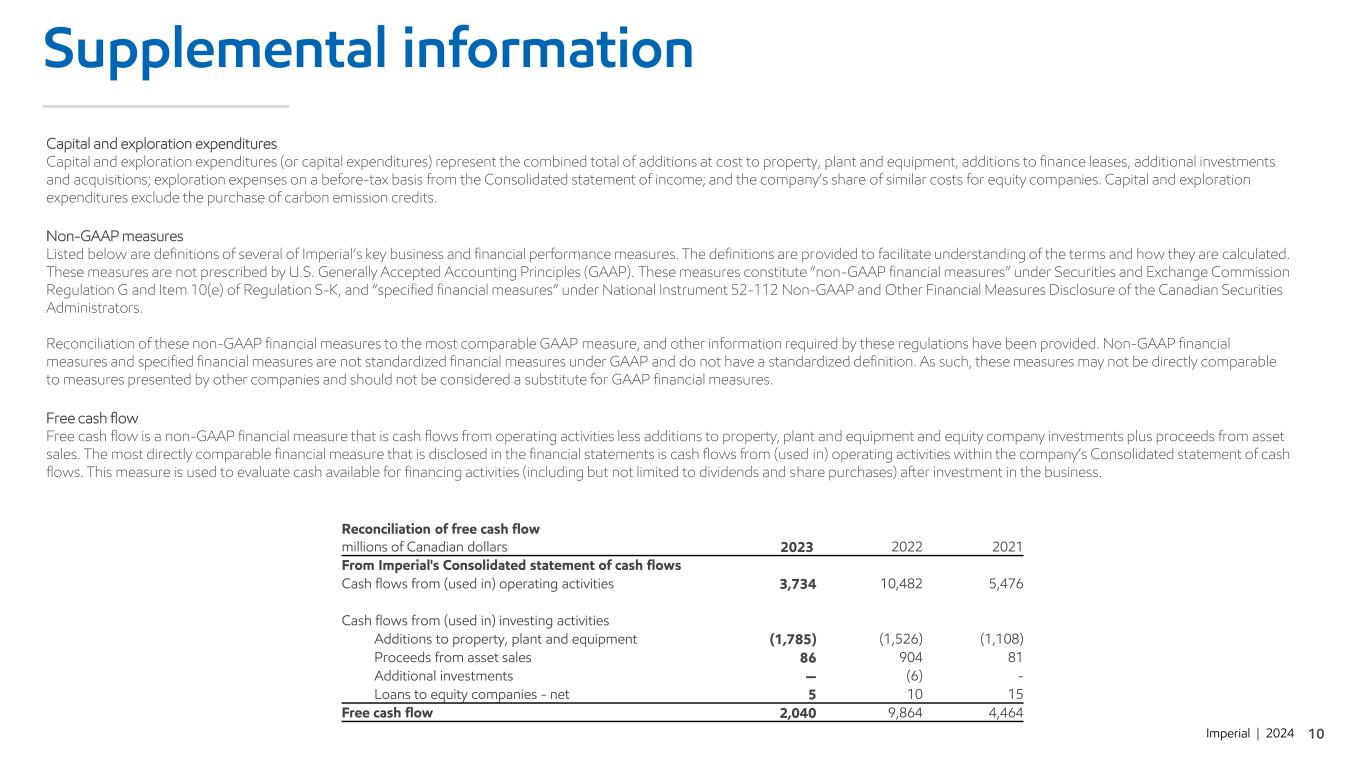 Reconciliation of historical non-GAAP measures is incorporated by reference and can be found in the company’s most recent annual report on Form 10-K under the heading “Frequently Used Terms”, or on the quarterly earnings press release under Attachment VI, available on EDGAR at www.sec.gov, SEDAR+ at www.sedarplus.ca, and the company’s website at www.imperialoil.ca.