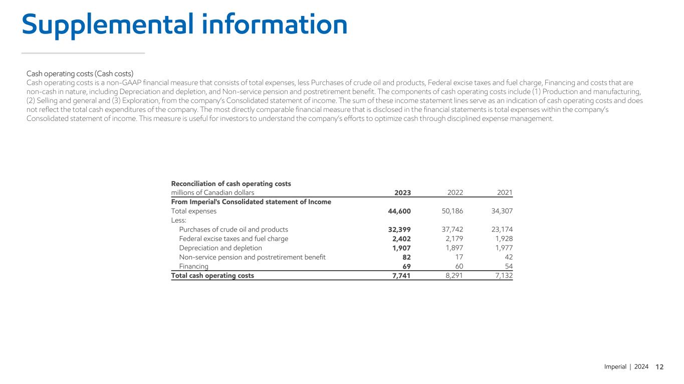 Cash operating costs is a non-GAAP financial measure that consists of total expenses, less purchases of crude oil and products, federal excise taxes and fuel charge, financing, and costs that are non-cash in nature, including depreciation and depletion, and non-service pension and postretirement benefit. The components of cash operating costs include "Production and manufacturing", "Selling and general" and "Exploration" from the company’s Consolidated statement of income. The sum of these income statement lines serves as an indication of cash operating costs and does not reflect the total cash expenditures of the company. The most directly comparable financial measure that is disclosed in the financial statements is "Total expenses" within the company’s Consolidated statement of income. This measure is useful for investors to understand the company’s efforts to optimize cash through disciplined expense management.