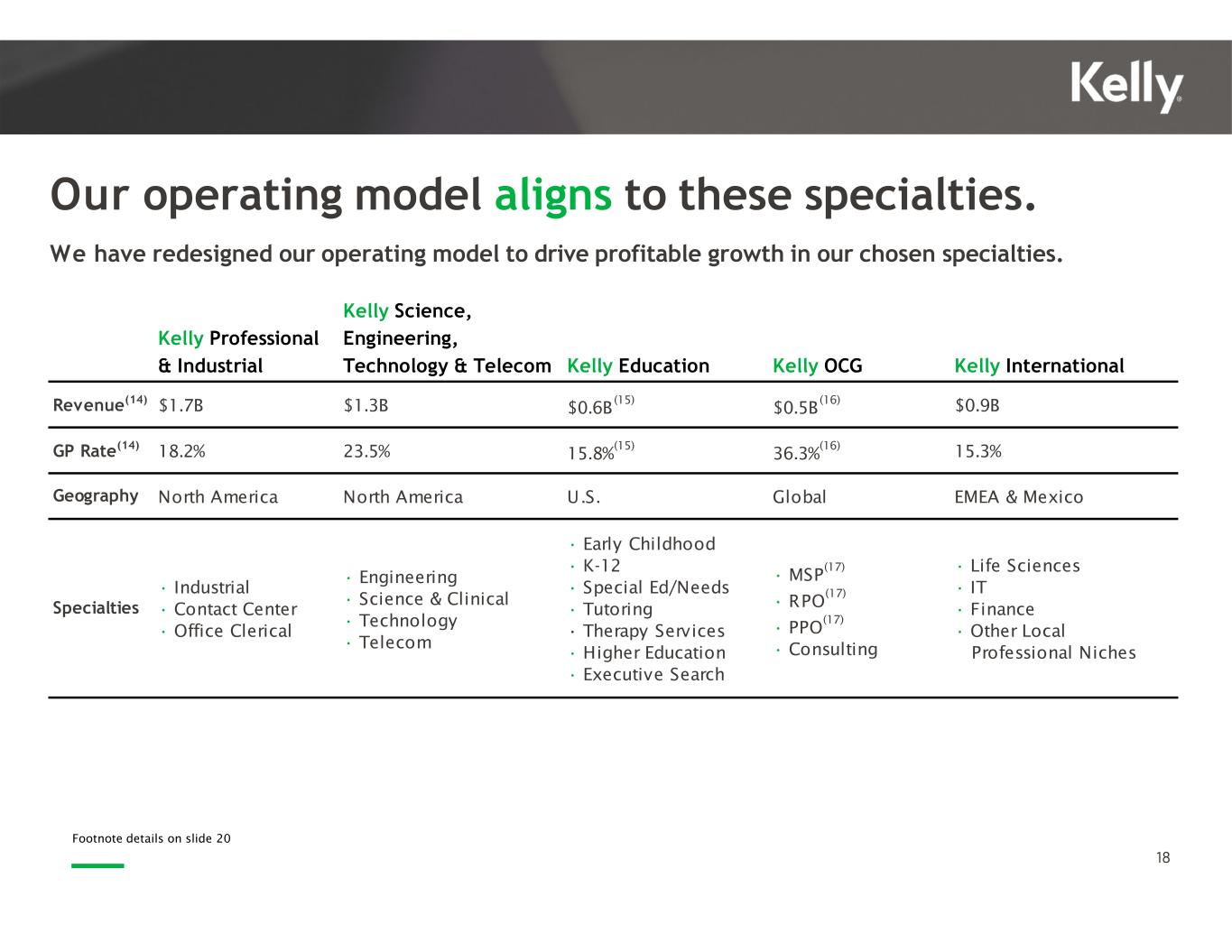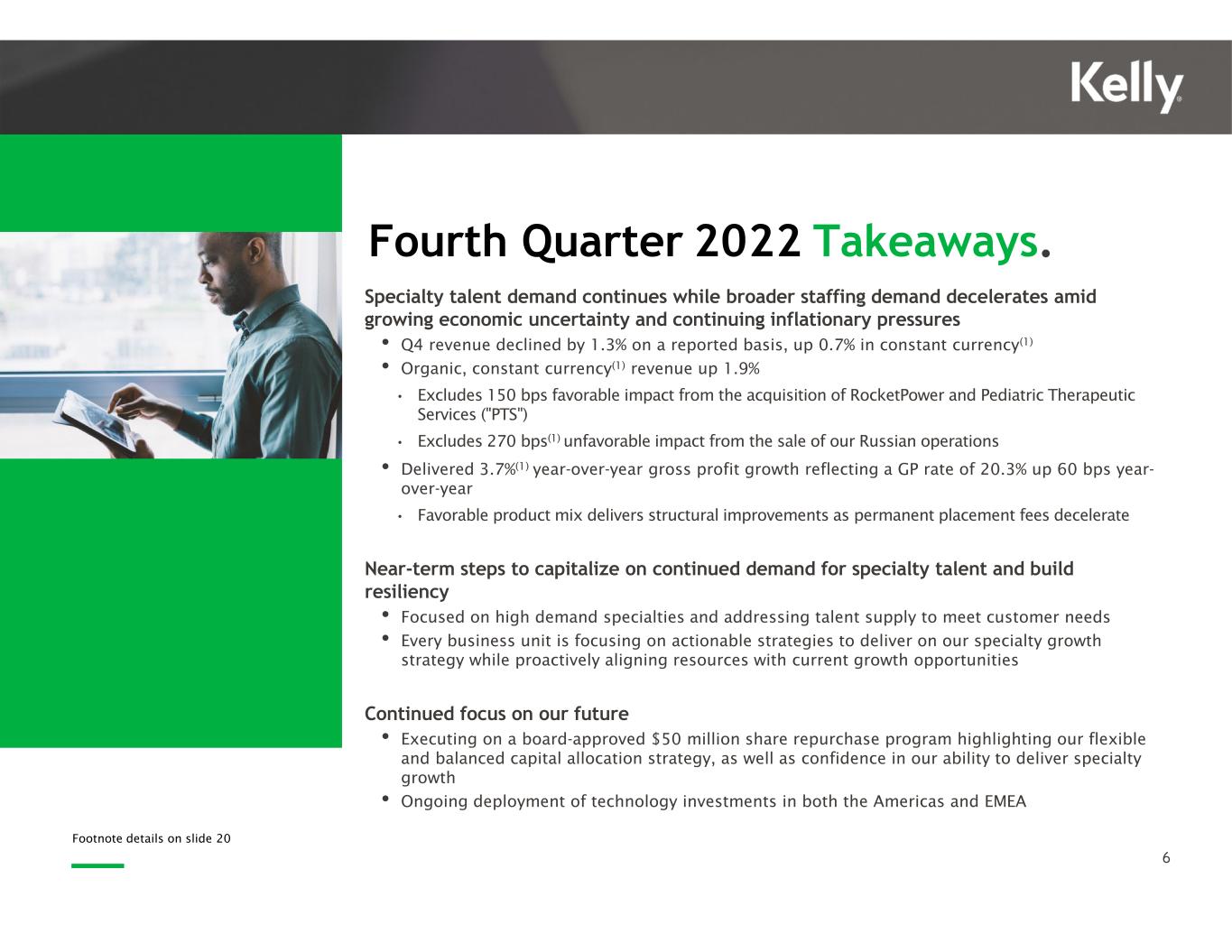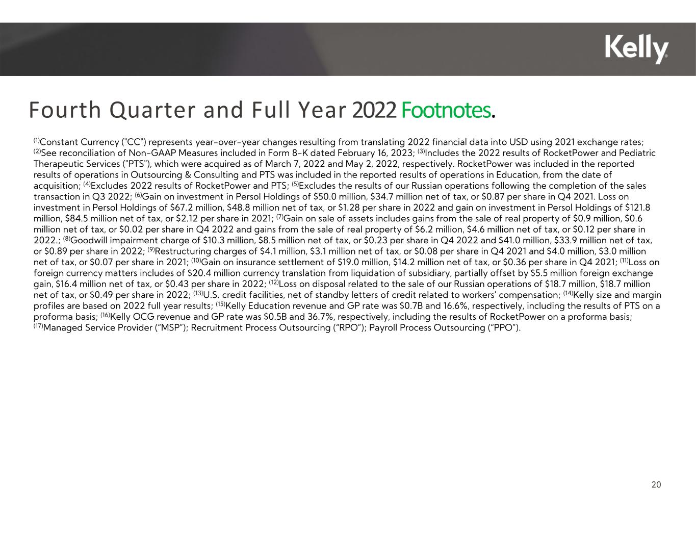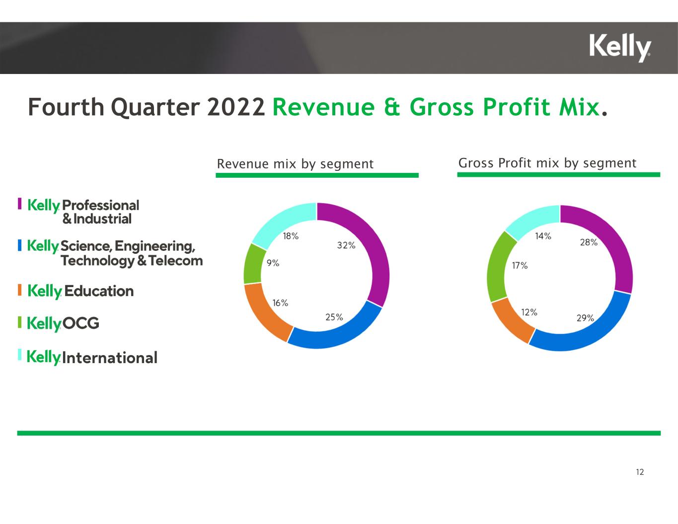 「第4四半期にマクロ経済の不確実性が高まる中、当社は専門性戦略の実行に注力し、教育、SET、OCGの各セグメントでトップラインの成長を達成し、利益率が高く価値の高い製品や専門性に向けたポートフォリオの組み換えを継続しながら前年同期比で粗利益率を拡大しました」とクイグレーは述べました。「2023年に向けてマクロ経済がどのような展開を見せるかを知ることは困難ですが、当社はケリー社をこの景気サイクルの中で管理できるように位置づけ、収益性の高い成長を積極的に追求していきます。十分な資金があるため、インオーガニック戦略を実行し、人材と顧客体験を向上させ、効率を高め、将来にわたってオーガニックな成長を可能にするテクノロジーと新製品への投資を続けていきます。"