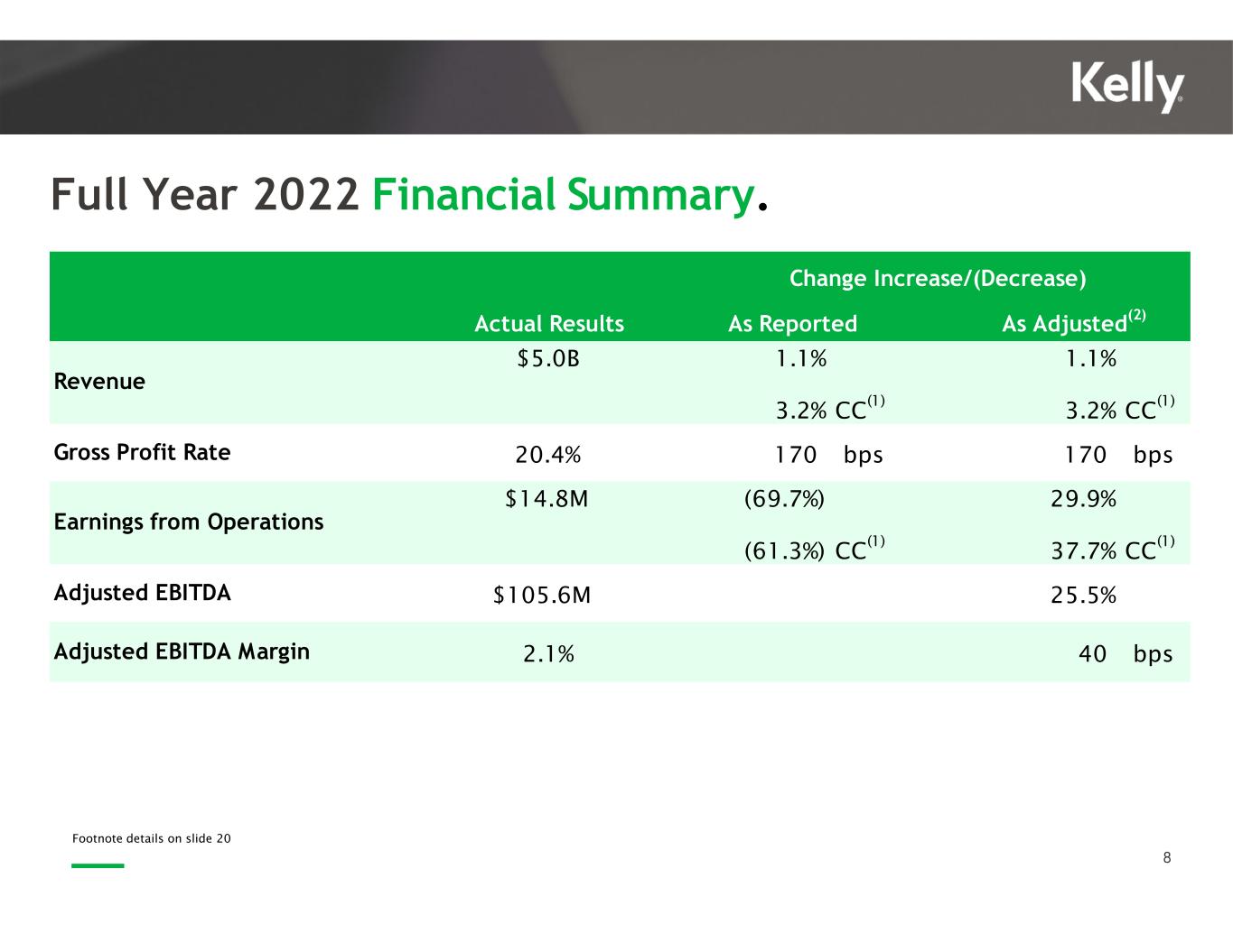 2022年通期の営業利益は1480万ドルで、2021年通期の利益は4860万ドルでした。2022年通期業績には、4100万ドルののれん代減損費用、ケリーのロシア事業の処分損1870万ドル、資産売却益620万ドルが含まれています。2021年通期業績には、400万ドルの構造改革費用が含まれています。調整後ベースでは、2022年通期の営業利益は6830万ドルで、2021年通期の5260万ドルと比べ30%改善しました。