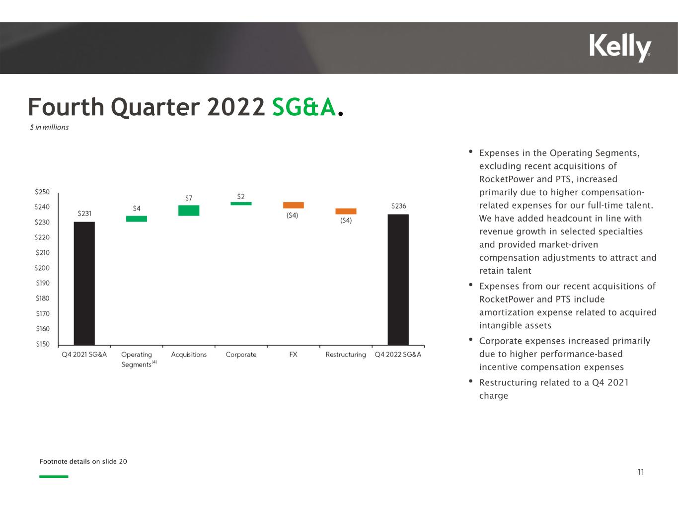 ケリーは2022年第4四半期に460万ドルの営業利益を計上しましたが、2021年第4四半期には1530万ドルの利益を計上しました。2022年第4四半期の利益には、RocketPowerに関連するのれん代減損費用1,030万ドルが含まれています。この費用は、ロケットパワーが得意とするハイテク産業における雇用減少の加速を反映しています。この減損費用と不動産売却に関連する0.9百万ドルの利益を除くと、調整後の営業利益は1,400万ドルでした。2021年第4四半期の収益には410万ドルの構造改革費用が含まれており、調整後の収益は1940万ドルでした。調整後利益は主に販売費および一般管理費の増加により減少しましたが、ビジネスミックスの構造的改善により売上総利益が増加した影響により一部相殺されました。