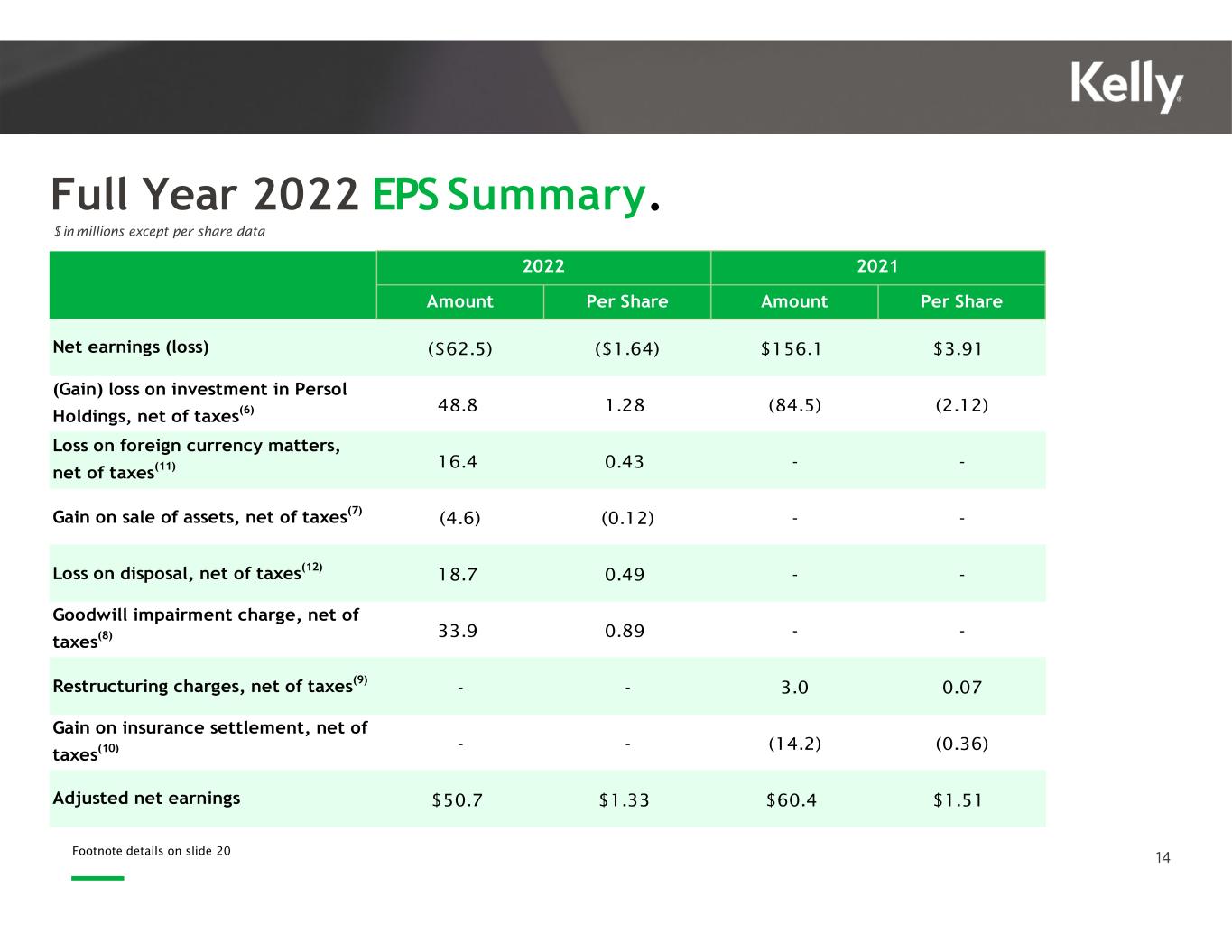 2022 年第 4 四半期の 1 株当たり損失は、2021 年第 4 四半期の 1 株当たり利益 1.80 ドルに対して 0.02 ドルでした。2022年第4四半期の1株当たり損失には、ロケットパワーに関連する1株当たり0.23ドルの税引き後ののれん代減損費用が含まれていますが、1株当たり0.02ドルの税引き後の不動産売却益で一部相殺されています。2021年第4四半期には、ケリーのパーソルホールディングス普通株式への投資に関する非現金利益(税引後)0.87ドル、保険和解利益(税引後)0.36ドルが含まれており、構造改革費用に関する損失(税引後)0.08ドルで一部相殺されています。調整後ベースの 2022 年第 4 四半期の 1 株当たり利益は 0.18 ドルとなり、前年同期の 1 株当たり 0.65 ドルから減少しました。