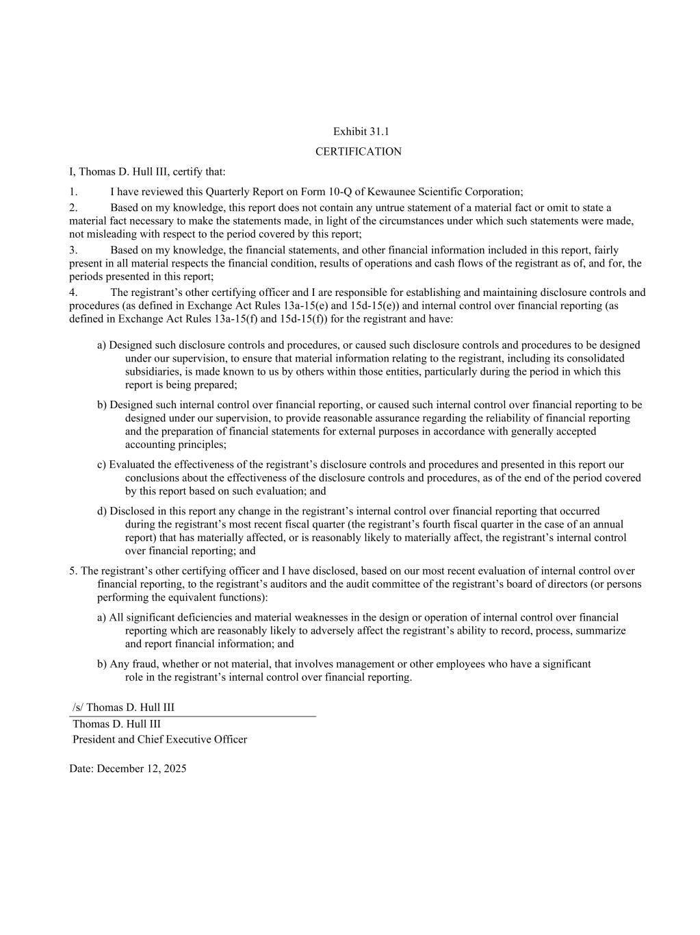 Exhibit 31.1 CERTIFICATION I, Thomas D. Hull III, certify that: 1. I have reviewed this Quarterly Report on Form 10-Q of Kewaunee Scientific Corporation; 2. Based on my knowledge, this report does not contain any untrue statement of a material fact or omit to state a material fact necessary to make the statements made, in light of the circumstances under which such statements were made, not misleading with respect to the period covered by this report; 3. Based on my knowledge, the financial statements, and other financial information included in this report, fairly present in all material respects the financial condition, results of operations and cash flows of the registrant as of, and for, the periods presented in this report; 4. The registrant’s other certifying officer and I are responsible for establishing and maintaining disclosure controls and procedures (as defined in Exchange Act Rules 13a-15(e) and 15d-15(e)) and internal control over financial reporting (as defined in Exchange Act Rules 13a-15(f) and 15d-15(f)) for the registrant and have: a) Designed such disclosure controls and procedures, or caused such disclosure controls and procedures to be designed under our supervision, to ensure that material information relating to the registrant, including its consolidated subsidiaries, is made known to us by others within those entities, particularly during the period in which this report is being prepared; b) Designed such internal control over financial reporting, or caused such internal control over financial reporting to be designed under our supervision, to provide reasonable assurance regarding the reliability of financial reporting and the preparation of financial statements for external purposes in accordance with generally accepted accounting principles; c) Evaluated the effectiveness of the registrant’s disclosure controls and procedures and presented in this report our conclusions about the effectiveness of the disclosure controls and procedures, as of the end of the period covered by this report based on such evaluation; and d) Disclosed in this report any change in the registrant’s internal control over financial reporting that occurred during the registrant’s most recent fiscal quarter (the registrant’s fourth fiscal quarter in the case of an annual report) that has materially affected, or is reasonably likely to materially affect, the registrant’s internal control over financial reporting; and 5. The registrant’s other certifying officer and I have disclosed, based on our most recent evaluation of internal control over financial reporting, to the registrant’s auditors and the audit committee of the registrant’s board of directors (or persons performing the equivalent functions): a) All significant deficiencies and material weaknesses in the design or operation of internal control over financial reporting which are reasonably likely to adversely affect the registrant’s ability to record, process, summarize and report financial information; and b) Any fraud, whether or not material, that involves management or other employees who have a significant role in the registrant’s internal control over financial reporting. /s/ Thomas D. Hull III Thomas D. Hull III President and Chief Executive Officer Date: December 12, 2025