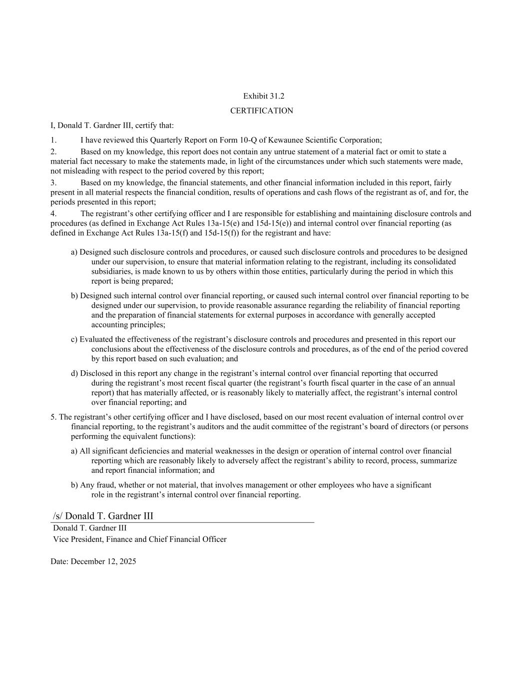 Exhibit 31.2 CERTIFICATION I, Donald T. Gardner III, certify that: 1. I have reviewed this Quarterly Report on Form 10-Q of Kewaunee Scientific Corporation; 2. Based on my knowledge, this report does not contain any untrue statement of a material fact or omit to state a material fact necessary to make the statements made, in light of the circumstances under which such statements were made, not misleading with respect to the period covered by this report; 3. Based on my knowledge, the financial statements, and other financial information included in this report, fairly present in all material respects the financial condition, results of operations and cash flows of the registrant as of, and for, the periods presented in this report; 4. The registrant’s other certifying officer and I are responsible for establishing and maintaining disclosure controls and procedures (as defined in Exchange Act Rules 13a-15(e) and 15d-15(e)) and internal control over financial reporting (as defined in Exchange Act Rules 13a-15(f) and 15d-15(f)) for the registrant and have: a) Designed such disclosure controls and procedures, or caused such disclosure controls and procedures to be designed under our supervision, to ensure that material information relating to the registrant, including its consolidated subsidiaries, is made known to us by others within those entities, particularly during the period in which this report is being prepared; b) Designed such internal control over financial reporting, or caused such internal control over financial reporting to be designed under our supervision, to provide reasonable assurance regarding the reliability of financial reporting and the preparation of financial statements for external purposes in accordance with generally accepted accounting principles; c) Evaluated the effectiveness of the registrant’s disclosure controls and procedures and presented in this report our conclusions about the effectiveness of the disclosure controls and procedures, as of the end of the period covered by this report based on such evaluation; and d) Disclosed in this report any change in the registrant’s internal control over financial reporting that occurred during the registrant’s most recent fiscal quarter (the registrant’s fourth fiscal quarter in the case of an annual report) that has materially affected, or is reasonably likely to materially affect, the registrant’s internal control over financial reporting; and 5. The registrant’s other certifying officer and I have disclosed, based on our most recent evaluation of internal control over financial reporting, to the registrant’s auditors and the audit committee of the registrant’s board of directors (or persons performing the equivalent functions): a) All significant deficiencies and material weaknesses in the design or operation of internal control over financial reporting which are reasonably likely to adversely affect the registrant’s ability to record, process, summarize and report financial information; and b) Any fraud, whether or not material, that involves management or other employees who have a significant role in the registrant’s internal control over financial reporting. /s/ Donald T. Gardner III Donald T. Gardner III Vice President, Finance and Chief Financial Officer Date: December 12, 2025