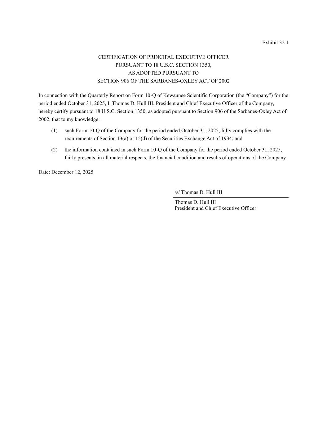 Exhibit 32.1 CERTIFICATION OF PRINCIPAL EXECUTIVE OFFICER PURSUANT TO 18 U.S.C. SECTION 1350, AS ADOPTED PURSUANT TO SECTION 906 OF THE SARBANES-OXLEY ACT OF 2002 In connection with the Quarterly Report on Form 10-Q of Kewaunee Scientific Corporation (the “Company”) for the period ended October 31, 2025, I, Thomas D. Hull III, President and Chief Executive Officer of the Company, hereby certify pursuant to 18 U.S.C. Section 1350, as adopted pursuant to Section 906 of the Sarbanes-Oxley Act of 2002, that to my knowledge: (1) such Form 10-Q of the Company for the period ended October 31, 2025, fully complies with the requirements of Section 13(a) or 15(d) of the Securities Exchange Act of 1934; and (2) the information contained in such Form 10-Q of the Company for the period ended October 31, 2025, fairly presents, in all material respects, the financial condition and results of operations of the Company. Date: December 12, 2025 /s/ Thomas D. Hull III Thomas D. Hull III President and Chief Executive Officer