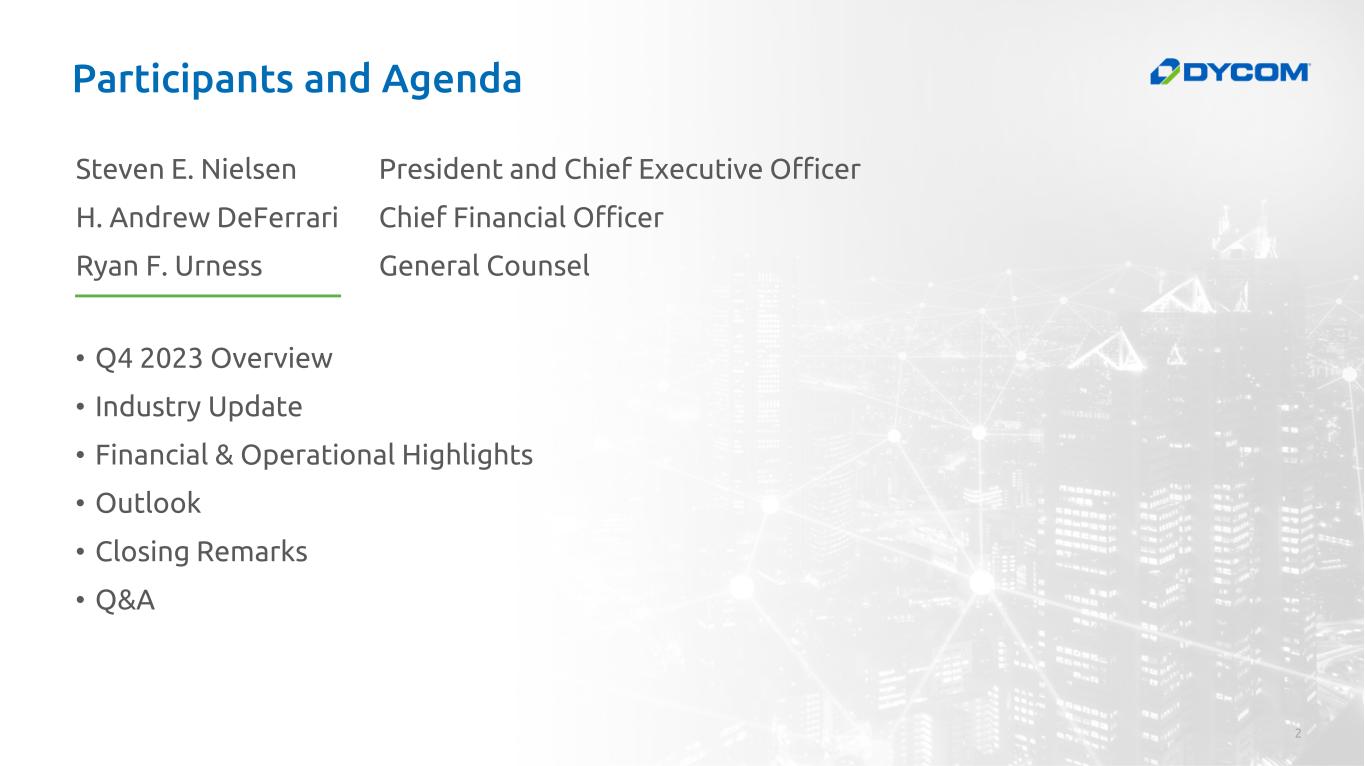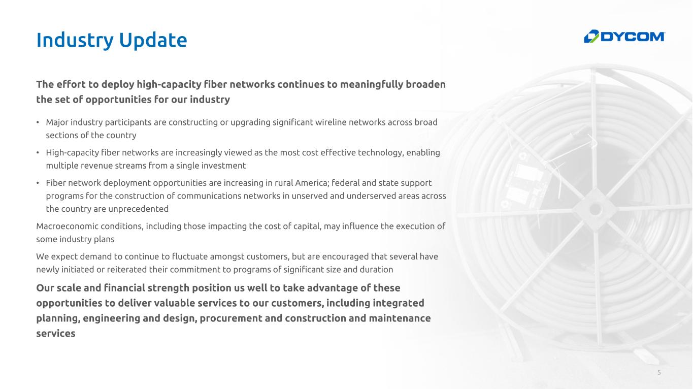 その他の参加者の皆様には、この会議のライブ音声ウェブキャスト(付随するスライドプレゼンテーションを含む)を、直接 https://edge.media-server.com/mmc/p/dmvuow2d でお聞きになることができます。ライブ放送の再放送と関連資料は、当社のインベスターセンターのウェブサイト(https://ir.dycomind.com)で、開催後約120日間ご覧いただけます。