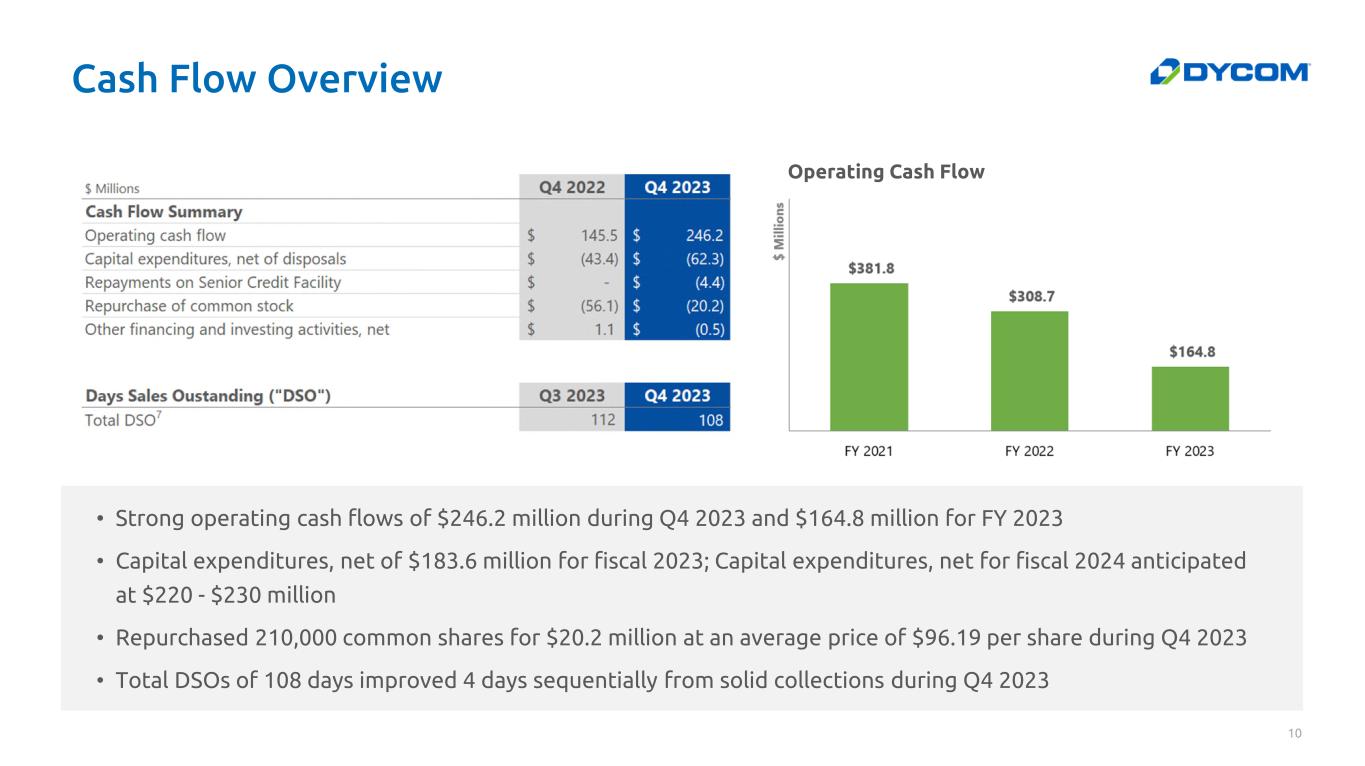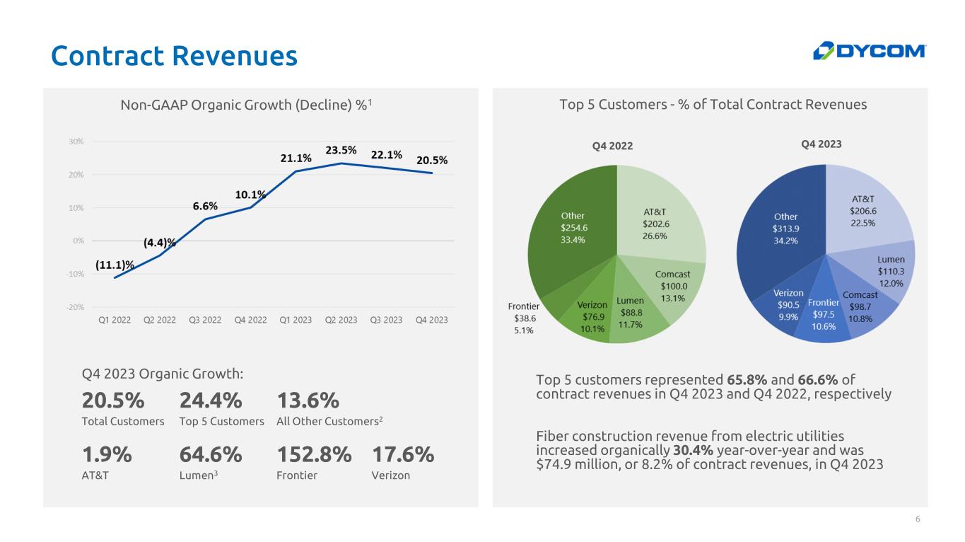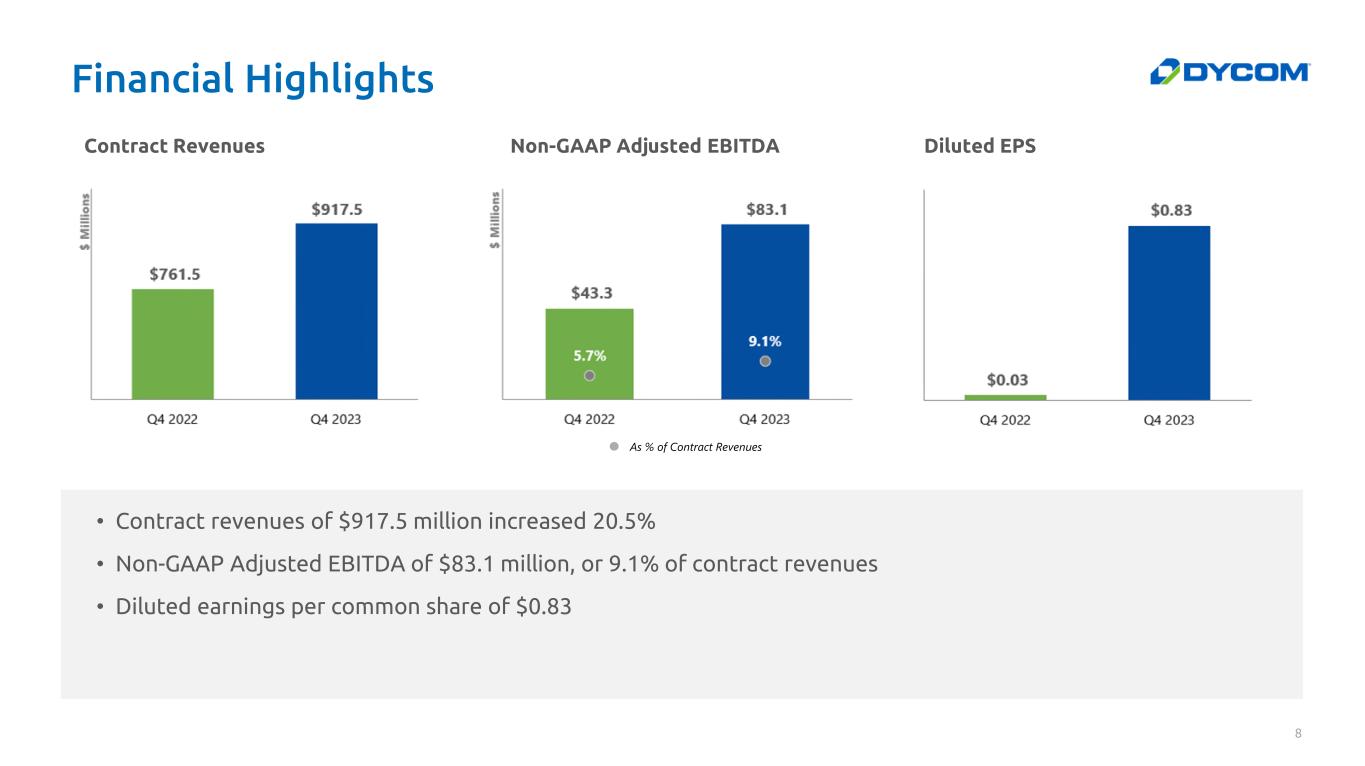 フロリダ州パームビーチガーデンズ、2023年3月1日 - ダイコム インダストリーズ(NYSE:DY)は本日、2023年1月28日に終了した第4四半期の業績を発表しました。2023年1月28日終了の第4四半期の契約収益は9億1750万ドルで、前年同期の7億6150万ドルと比べ20.5%増加しました。2023 年 1 月 28 日に終了した第 4 四半期の非 GAAP 調整後 EBITDA は 8,310 万ドル、契約収益の 9.1%となり、前年同期には 4,330 万ドル、契約収益の 5.7%となりました。