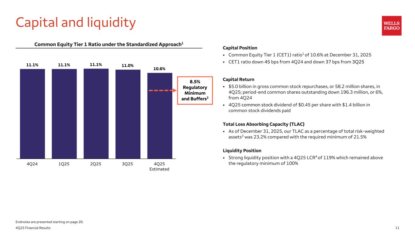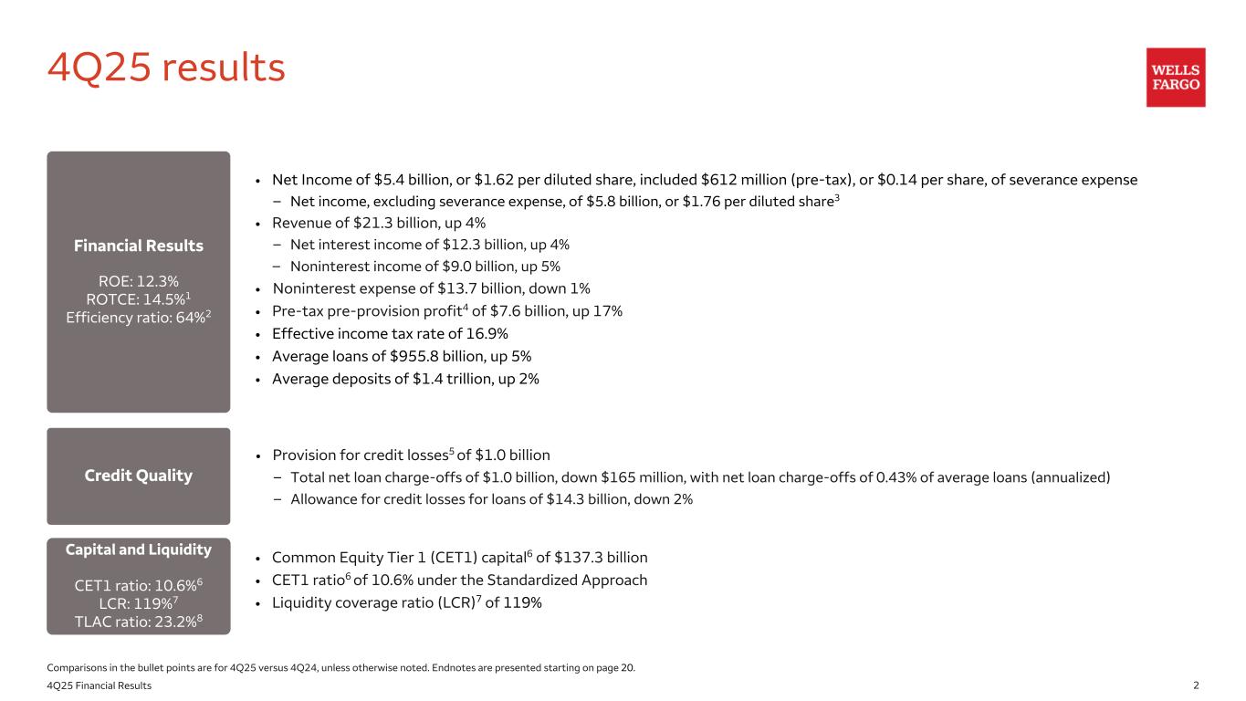 ニュースリリース | 2026年1月14日ウェルズ・ファーゴ、2025年第4四半期の純利益は54億ドル(希薄化後1株当たり1.62ドル)特記事項を除く純利益は58億ドル(希薄化後1株当たり1.76ドル)¹