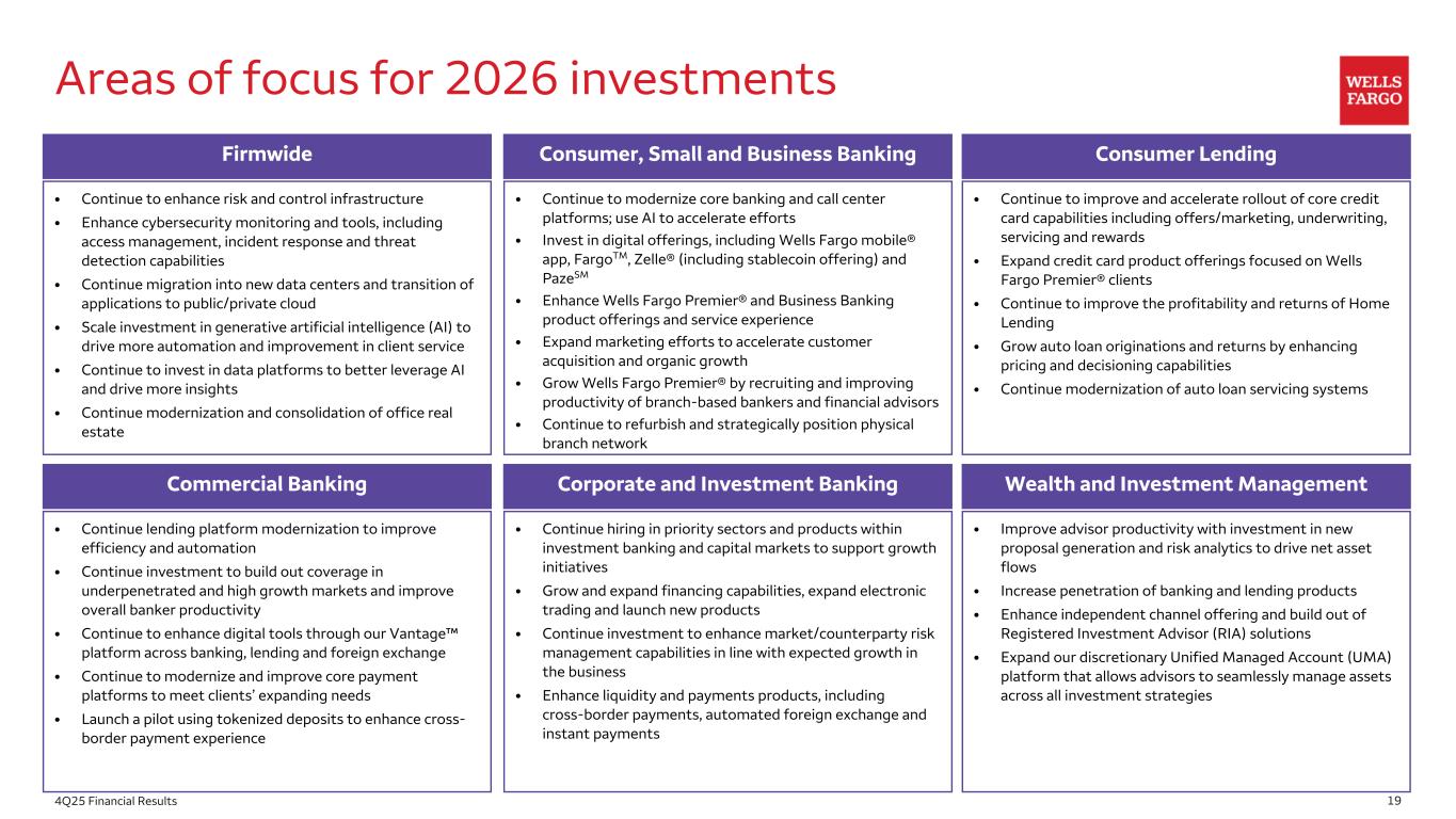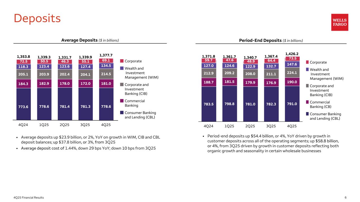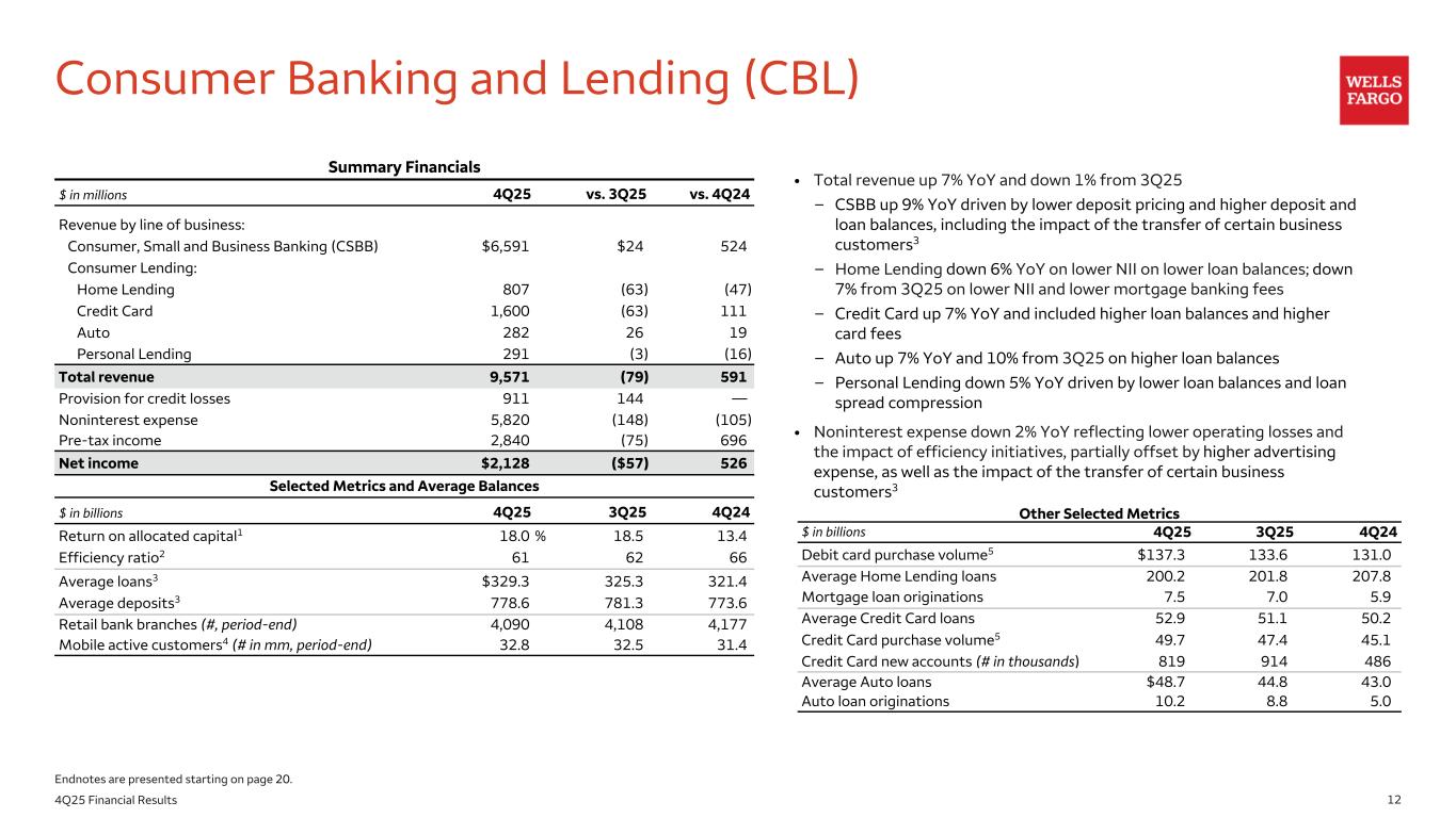 会長兼最高経営責任者(CEO)のチャーリー・シャーフは次のように述べた。「堅調な財務実績、連邦準備制度理事会(FRB)による資産上限規制の撤廃、複数の同意命令の終了、そして消費者向け事業と法人向け事業の両方における成長加速により、2025年度の業績を誇りに思う。当社は従来のROTCE5目標である15%を達成し、新たな中期目標として17~18%を設定した。 2024年度通期と比較すると、希薄化後1株当たり利益は17%増加、手数料収入は5%増加、純貸倒償却が16%減少したことで信用実績は堅調に推移し、経費増加率は1%未満に抑えられました。 当社は引き続き大幅な過剰資本を維持しつつ、2025年には普通株180億ドルの自社株買いと普通株1株当たり配当金の13%増額により、計230億ドルを株主に還元しました。短期的な業績と長期的な成功に向けた投資のバランスを取るべく尽力してきました。 全社的な効率化による大幅なコスト削減を推進することで、インフラと事業成長への投資を大幅に増やしました。過去5年間で総経費を150億ドル削減したことで、経費総額を抑制しながらこれらの投資を実現できました。」「成長加速の兆候は全社的に見られます。消費者向け事業では、クレジットカードの利用額が引き続き堅調に増加し、新規口座数は前年比20%超の伸びを示しました。 自動車ローンは前年比19%増で成長軌道に復帰。当座預金口座の純増は堅調に推移し、富裕層向けサービス「ウェルズ・ファーゴ・プレミア®」の預金・投資残高は前年比14%増加。資産運用・投資管理部門のアドバイザリー手数料は8%増となりました。法人向け事業では、融資残高が12%増加。投資銀行手数料は14%増加しました。 投資銀行部門の市場シェアを拡大し、M&Aランキングは12位から8位に上昇しました」とシャーフは付け加えた。「我々は強固な基盤を築き、大きな制約下での運営にもかかわらず、成長と収益性の改善において大きな進展を遂げました。 「今後は公平な競争環境で戦えることに興奮しています。バランスシートを拡大できるため、成長にさらに多くのリソースを投入可能です。ウェルズ・ファーゴの全従業員の献身と努力により、当社は強固な基盤で2026年を迎えられます。現在の勢いと今後の機会に大きな期待を寄せています」とシャーフは締めくくった。