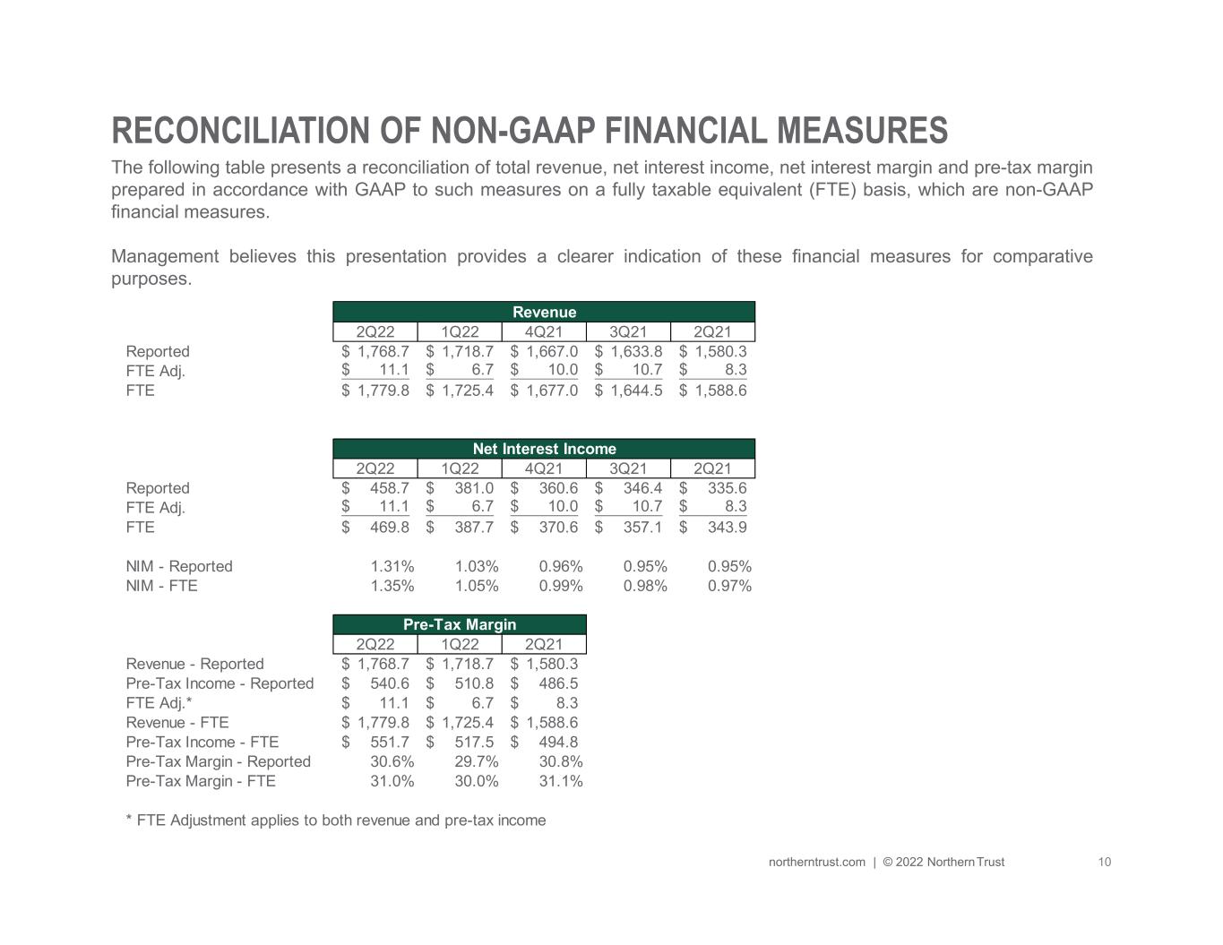 | Northern Trust presents certain financial measures on a fully taxable equivalent (FTE) basis, which is a non-generally accepted accounting principle (GAAP). Management believes an FTE presentation provides a clearer indication of these financial measures for comparative purposes. Net interest income (FTE) – Non-GAAP and net interest margin (FTE) – Non-GAAP and other FTE measures include the tax equivalent adjustments on tax-exempt income, consistent with industry practice. The adjustments are based on the federal income tax rate, where the rate is adjusted for applicable state income taxes, net of related federal tax benefit. When adjusted to an FTE basis, yields on taxable, nontaxable, and partially taxable assets are comparable; however, the adjustment to an FTE basis has no impact on net income. Below is a reconciliation of the financial measures presented on an FTE basis. |